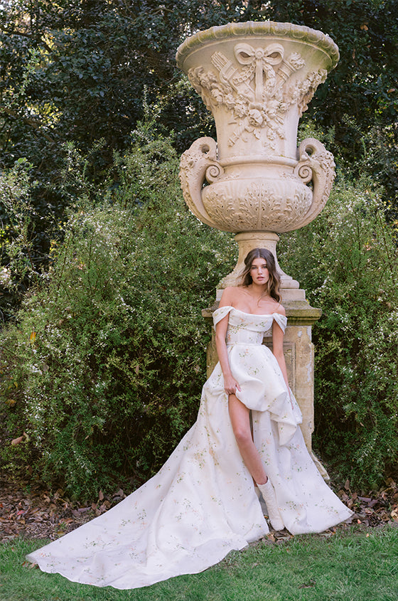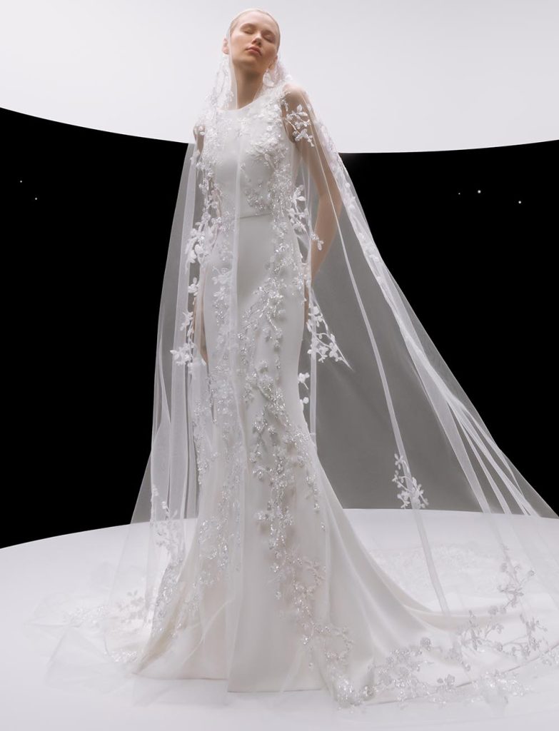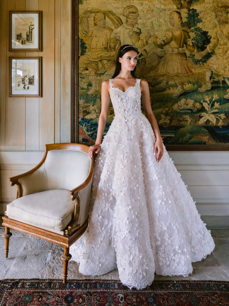 Renowned for her romantic aesthetic and exquisite craftsmanship, Monique Lhuillier captures the essence of femininity with her bridal collection for 2024. Drawing inspiration from the enchanting beauty of nature, Lhuillier’s designs feature delicate floral motifs, soft ruffles, and whimsical layers of tulle. Silhouettes range from ethereal A-line dresses to form-fitting mermaid gowns, each exuding an air of effortless chic and timeless grace. With a focus on intricate detailing and luxurious fabrics, Lhuillier’s collection embodies the epitome of bridal sophistication.