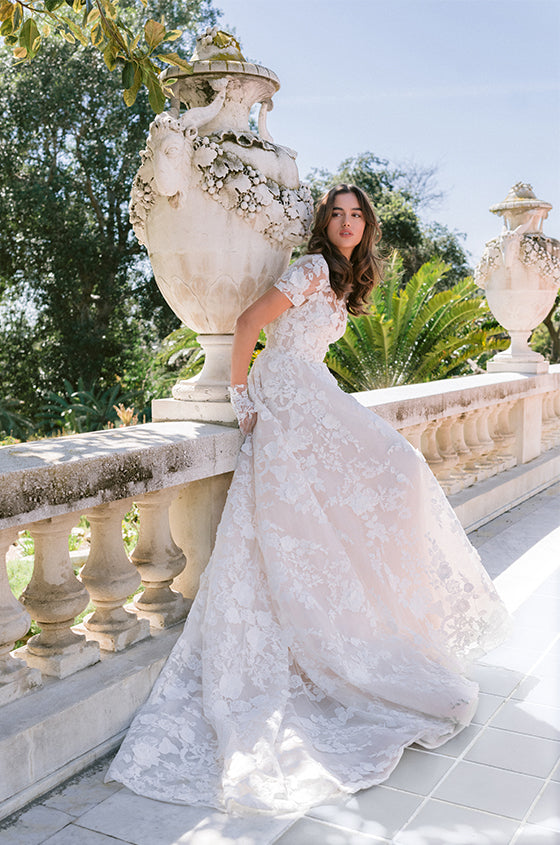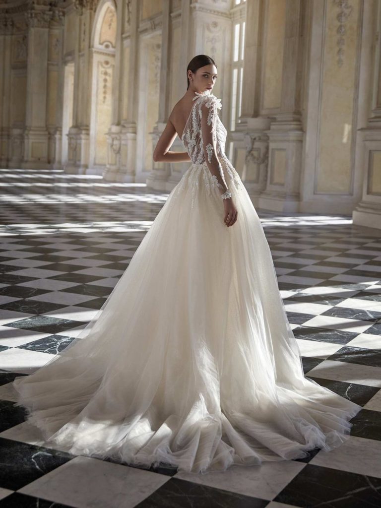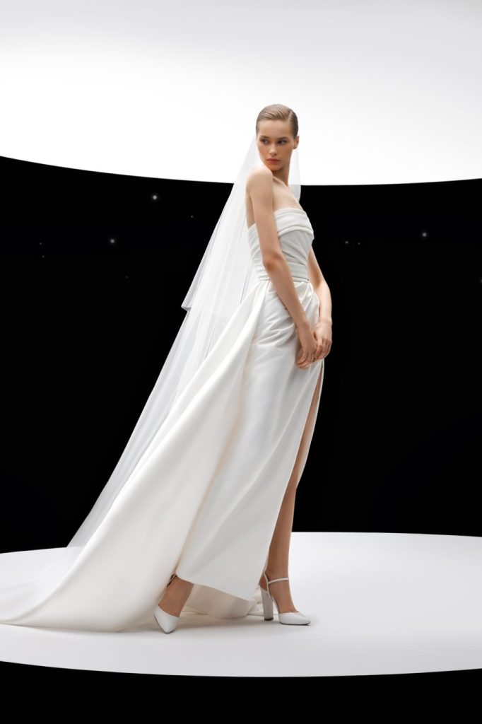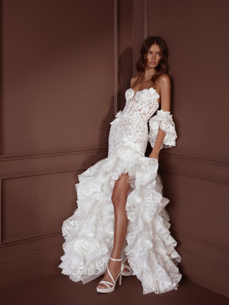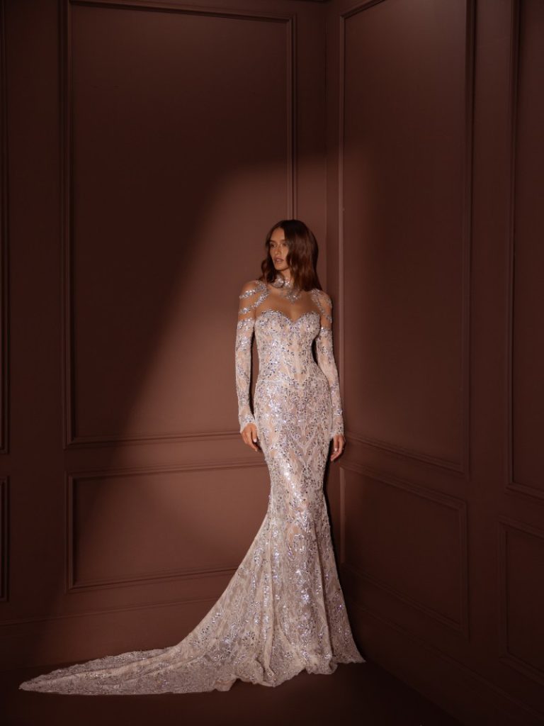For the bride seeking to make a bold and unforgettable statement, Pnina Tornai’s collection for 2024 offers an array of show-stopping designs that exude confidence and allure. Known for her daring silhouettes and intricate embellishments, Tornai’s creations feature figure-hugging mermaid dresses, plunging necklines, and dramatic trains. Luxurious fabrics such as satin, lace, and tulle are adorned with shimmering beadwork and ornate embroidery, creating a sense of opulence and glamour fit for a modern-day princess.
