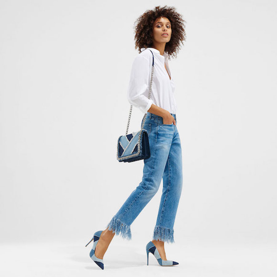 Alongside jeans, there are also brooches, playful and small, used mostly to spice up your classic denim piece, such as a jacket or a shoulder bag, which change your look. While the trend seems reminiscent of the 90’s, it doesn’t look retro, which I appreciate. It feels like fashion often turns to the past for inspiration, but it should nevertheless stay contemporary and focused on the present moment, which is its objective. Right now, a denim bag is an it-item, and denim stilettos play an important part as well.