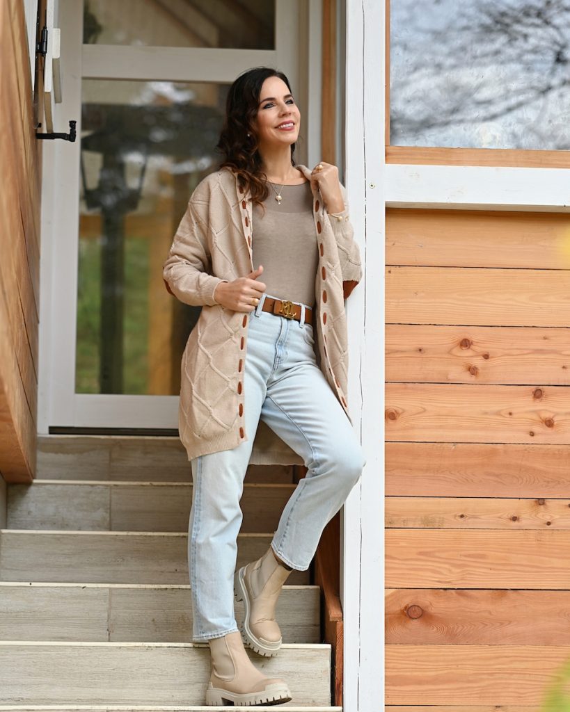 I think that long cardigans are a great options with jeans and tops, plus they are really comfy and make us feel “at home”. Sometimes balancing proportions and layering with this look can be hard, but if you know the rules, you can play well! For example pay attention to where your top underneath hits on your body. With a long cardigan, a top that hits closer to your natural waist will elongate your legs and give you a more proportional look.