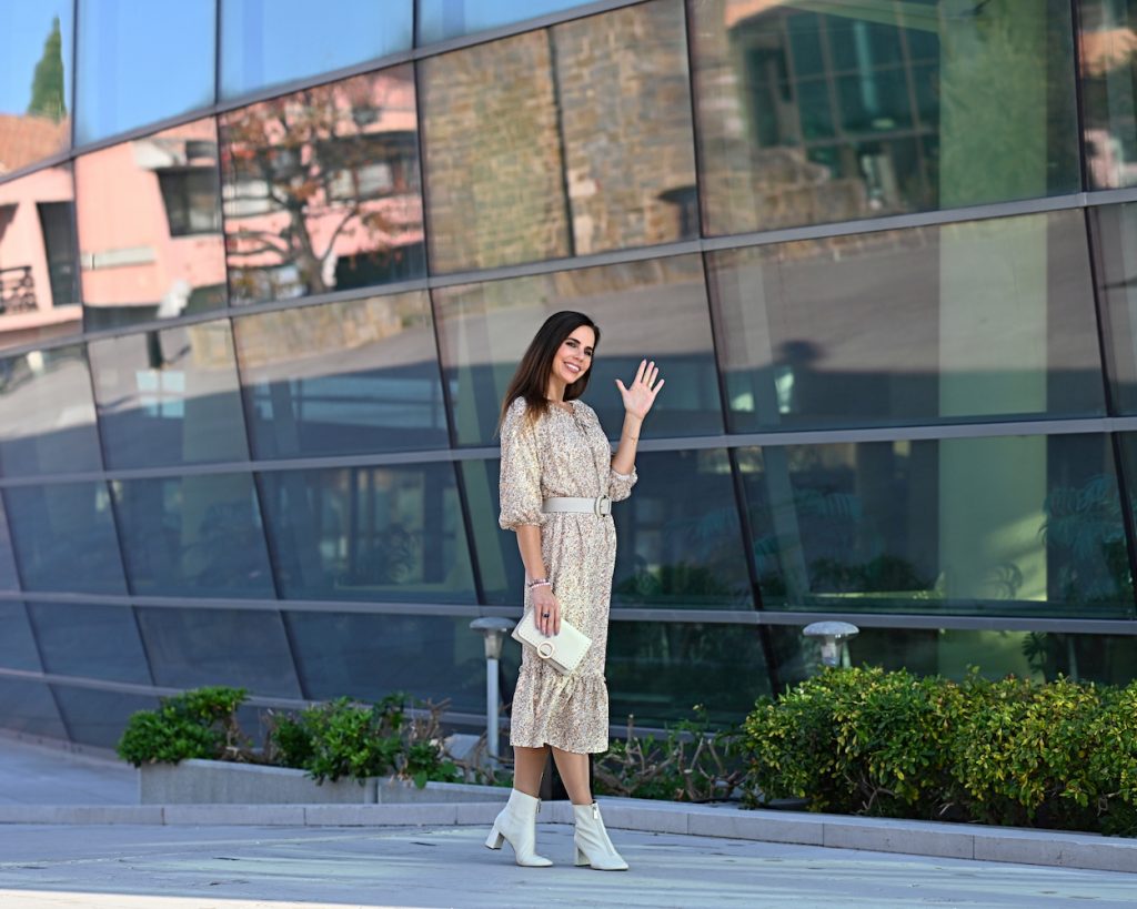 Ok, it’s not winter yet, but outside is quite cold and keep enjoying life while waring bright colors. I think this ice white coat was the best investment ever and I love the midi dress with small golden leaves and flowers, I nice souvenir from Tenerife island. White boots in winter are a real challenge, but they are so feminine and chic that I’m alway happy when I can choose them. The new age of styling says you should wear bright colors in the cold season – especially accessories if you are still wary of white trousers in muddy days. With all the fog, rain and cold weather of these days I’m really happy I was able to catch a little bit of sun while shooting the Style of the day.