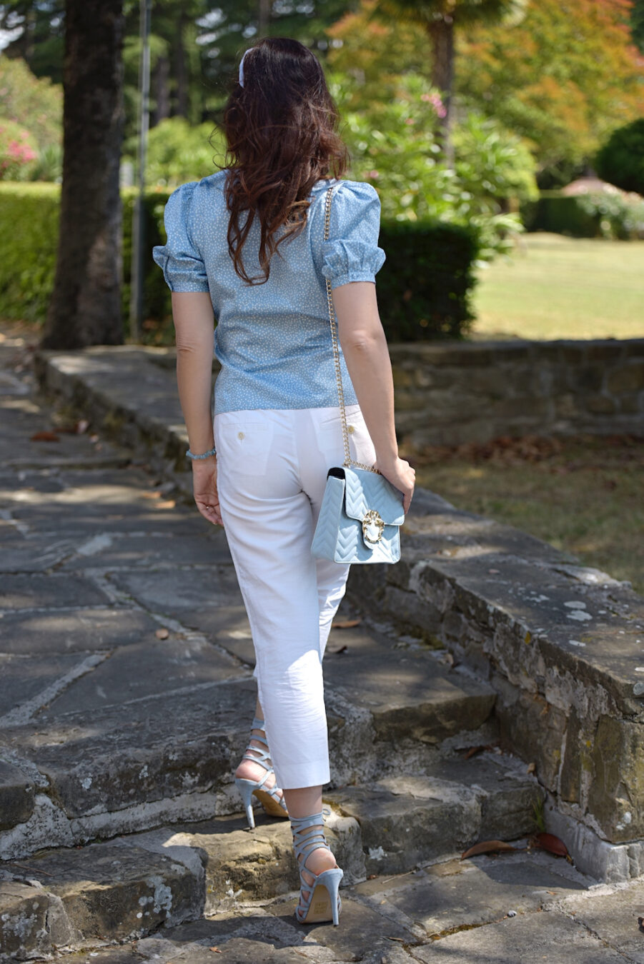 Throughout history bowties had been associated as a strictly male accessory until the 1920s when they officially began to be introduced in women’s wear as a form of gender bending. Women chose to either wear bowties around their neck or wear a more subtle form of the bowtie, a ribbon. Since then fashion has evolved and bows are now a big trend, hitting blouses, skirts, accessorises, dresses, head bands, shoes. This blouse puts together three big summer trends: the puff sleeves, the bow and the ruffles. Plus I can add an amazing shade of blue and the eternal polka dot motive. I decided to combine it with a simple pair of whit pants, but it is amazing also with shorts and flat sandals, or a good pair of jeans. A very versatile piece of my wardrobe, that I already adore.