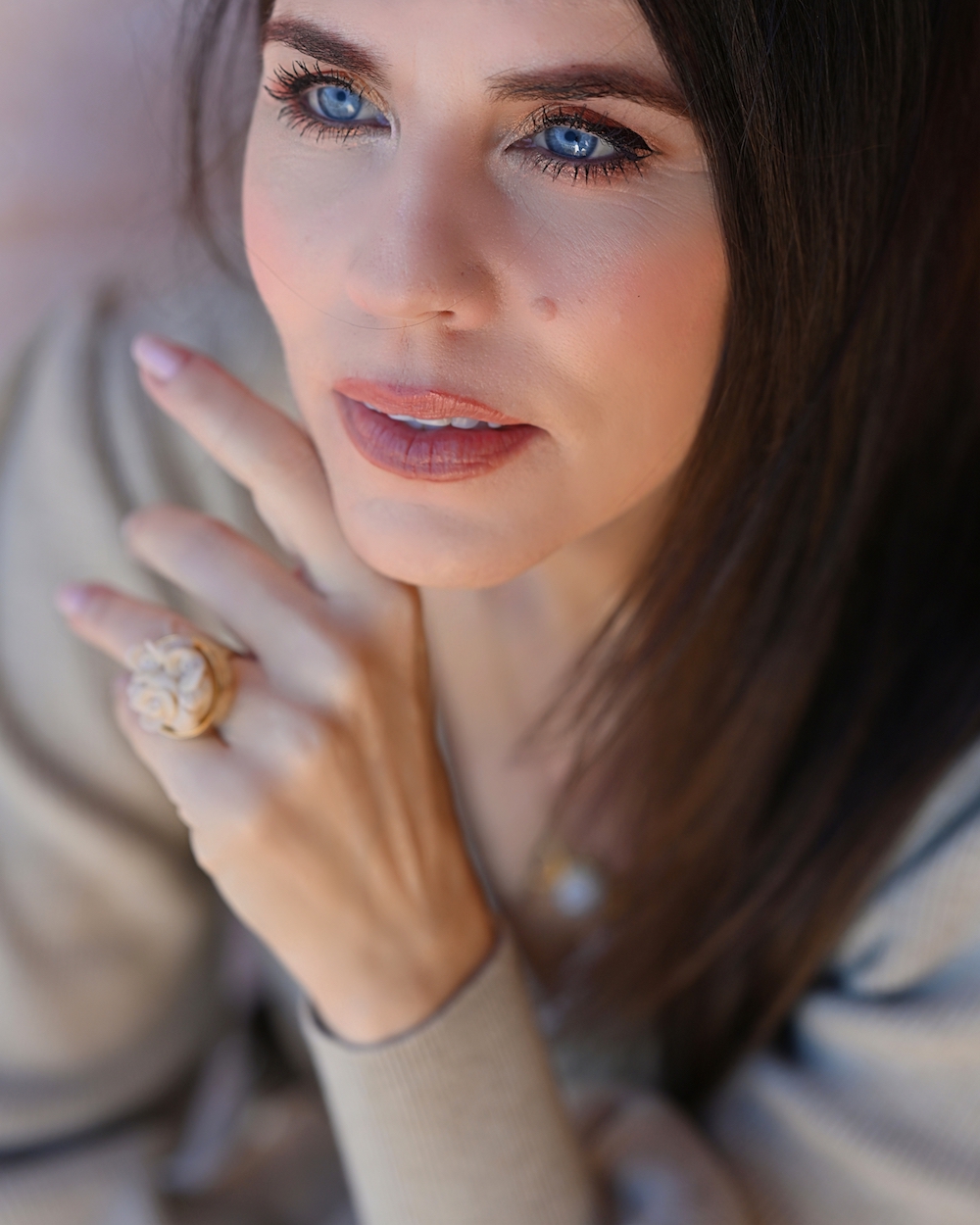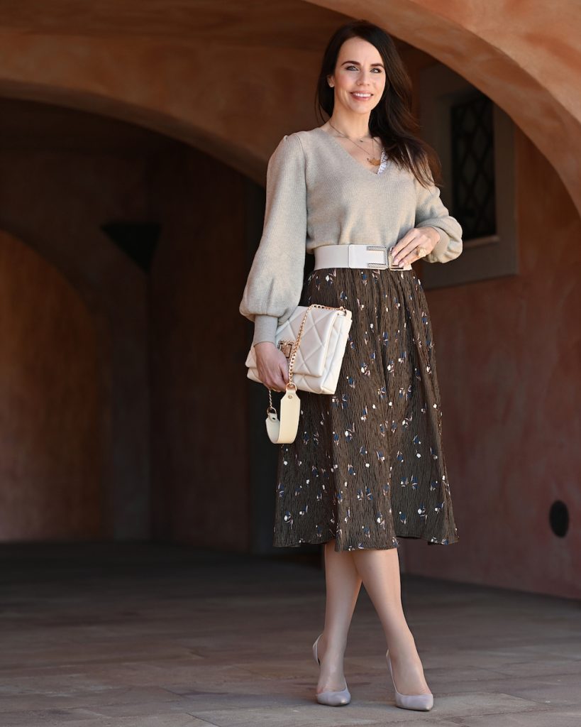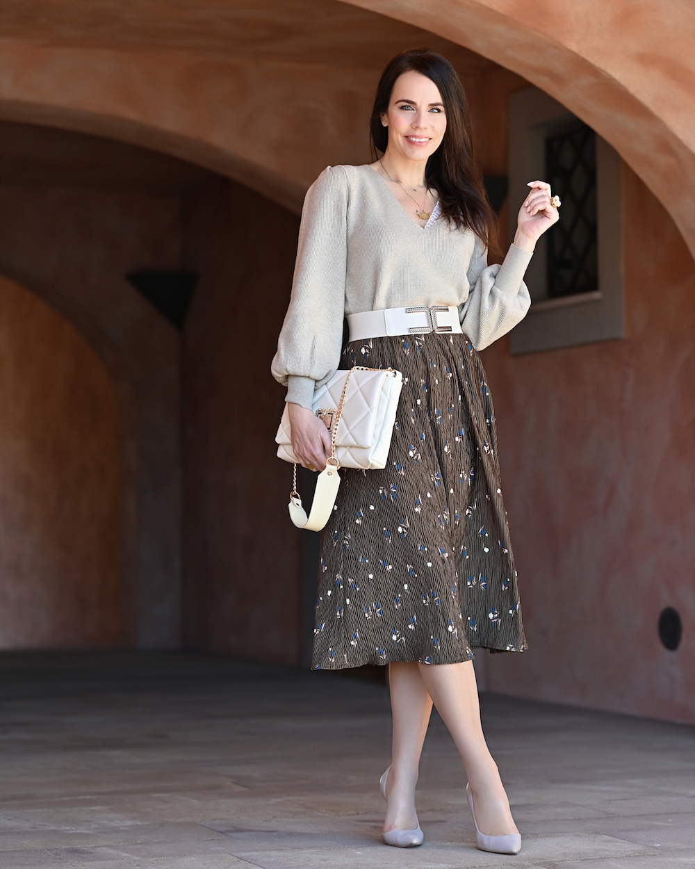 Today I paired my velvet skirt with a simple beige knitwear (look at the sleeve, they are really stunning!) so the skirt keeps the balance with the femininity. I also love that the skirt has pleats and is very flowy, plus the little flowers for a vintage touch of style. It’s such a classic look and I hope this trend returns again for the next year, it is a must have, so easy to wear. have a look also at the details: the belt and bag in a bright shade of ivory are the final touch: I just love how everything goes together!