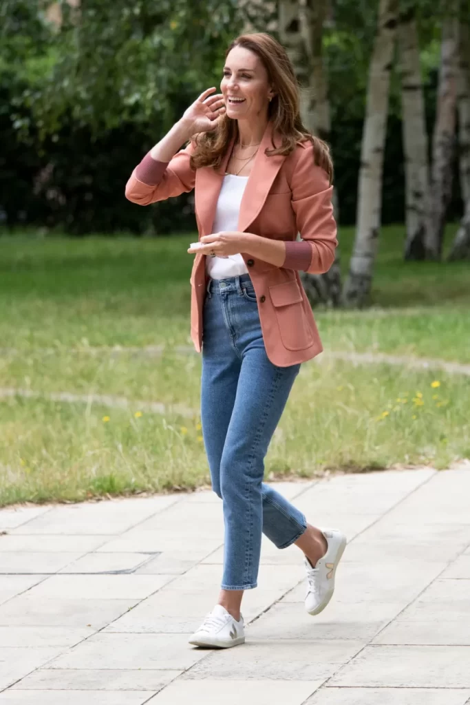 The amazing Kate Middleton is not an exeption, it seems she has a wardrobe full of blazers, structured, short, long, colorful, sporty, or super elegant. She loves to combine them with jeans or skinny pants, there are no limits to how you can style a blazer, whether you opt for a classic navy topper with a white t-shirt and jeans, an oversize linen style with leather shorts or a mini skirt, or even with sweatpants. On days when you don’t know what to wear, a white shirt, black blazer, and high-heel combo will never fail you. Bonus points if you throw a bright hue into the mix.
