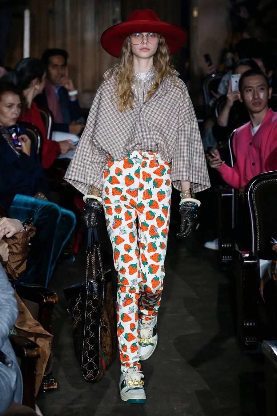 While florals are always in during the warmer months, this season we’re looking for a cool-girl alternative. Fruit prints are the right decision and something we have to try, even on a swimsuit. Fruits are about to be in high demand during the hot season – and we’re not referring to those you can pick up at the local supermarket. Nope, these fruits are a la mode, designer-approved. Gucci pushes the envelope in maximalism once again, and everything from bags to clutches and pants were garnished with look-at-me strawberry prints. Altuzarra had a couple of glossy pink co-ords that brimmed with paillettes and pastures of berry-esque flowers. And we’d leave it to Thom Browne to really go all out; This show was bananas! Whether they came as gigantic bejewelled headgear, vibrantly printed on coats or in some extreme cases, dressing the face of the models, these fruits are fully ripe for the picking.