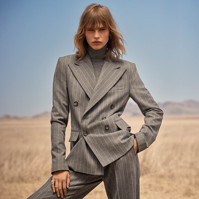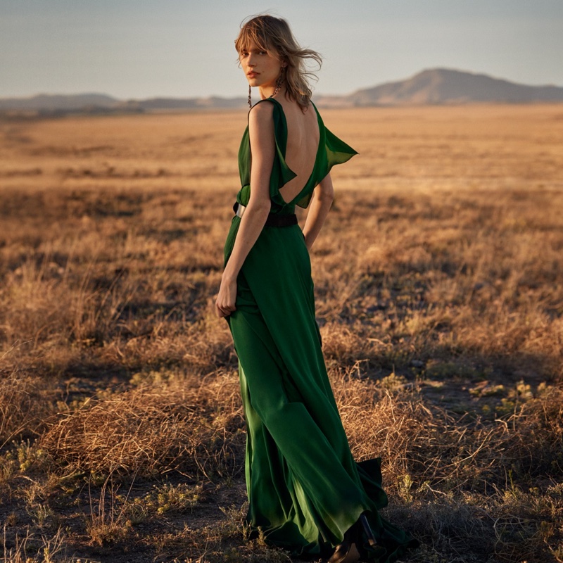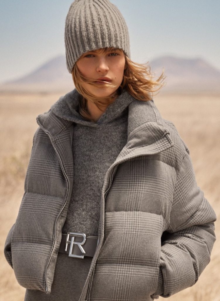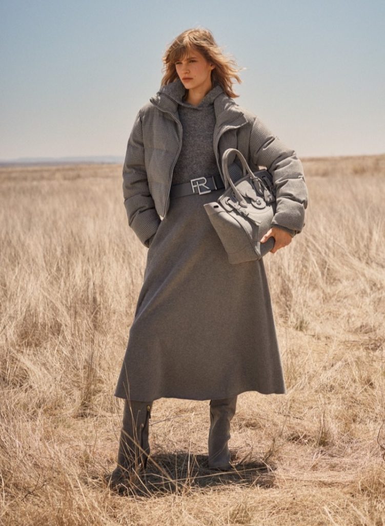 Ralph Lauren’s newest lineup of clothing for fall 2023 doesn’t just salute the American Southwest—it appears in its vast landscape. Shot against the backdrop of Marfa, Texas, the collection offers a world where rugged meets refinement. Aivita Mūze and Nour Rizk, the models appearing in the Ralph Lauren fall 2023 shoot, wear a mix of elegant gowns and structured blazers. Move over greys and tans—a neutral dominion is punctuated with bursts of emerald green and regal burgundy. These colors don’t merely accessorize; they command attention. Voluminous puffer jackets share the stage with wide-leg pants and cable-knit sweaters. Statement belts and flared trousers channel western style with elegance.