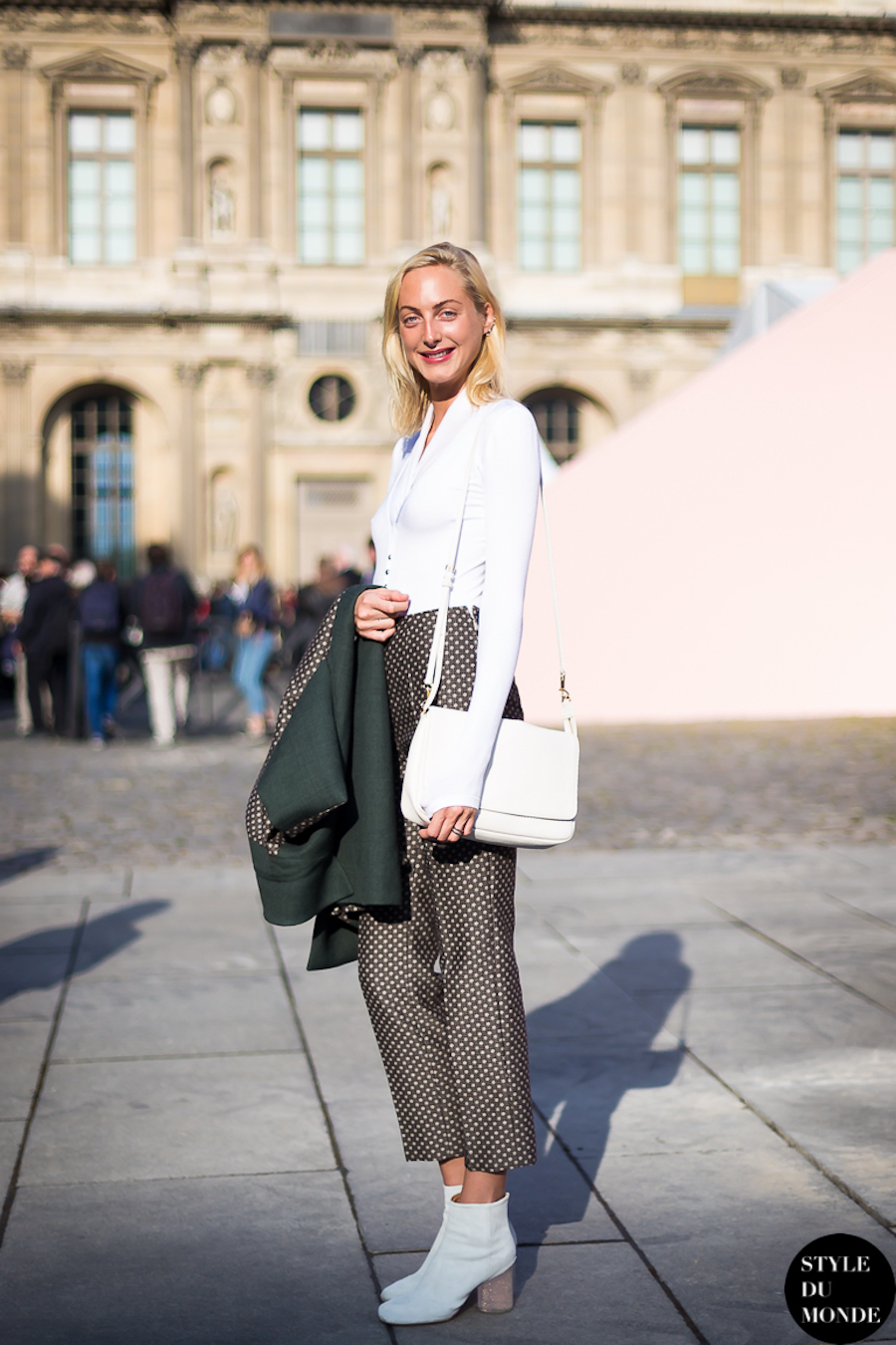 White boots will look gorgeous with plaid trousers, a big trend of the moment: they will create a nice contrast, so they’re a worthy investment. When it comes to dresses and skirts, the stakes are higher. White boots are usually half way between regular and ankle boots, which means they’re not too high, so they can optically cut the leg shorter. SO if you’re not exactly a gazelle with super long legs, stick to pants, it’s a safer terrain. One last piece of advice: white boots don’t mean your bag should match, it’s actually preferable to make them the only bit of white you’re wearing, because that makes them stand out, especially in a season we usually stick to darker colors.