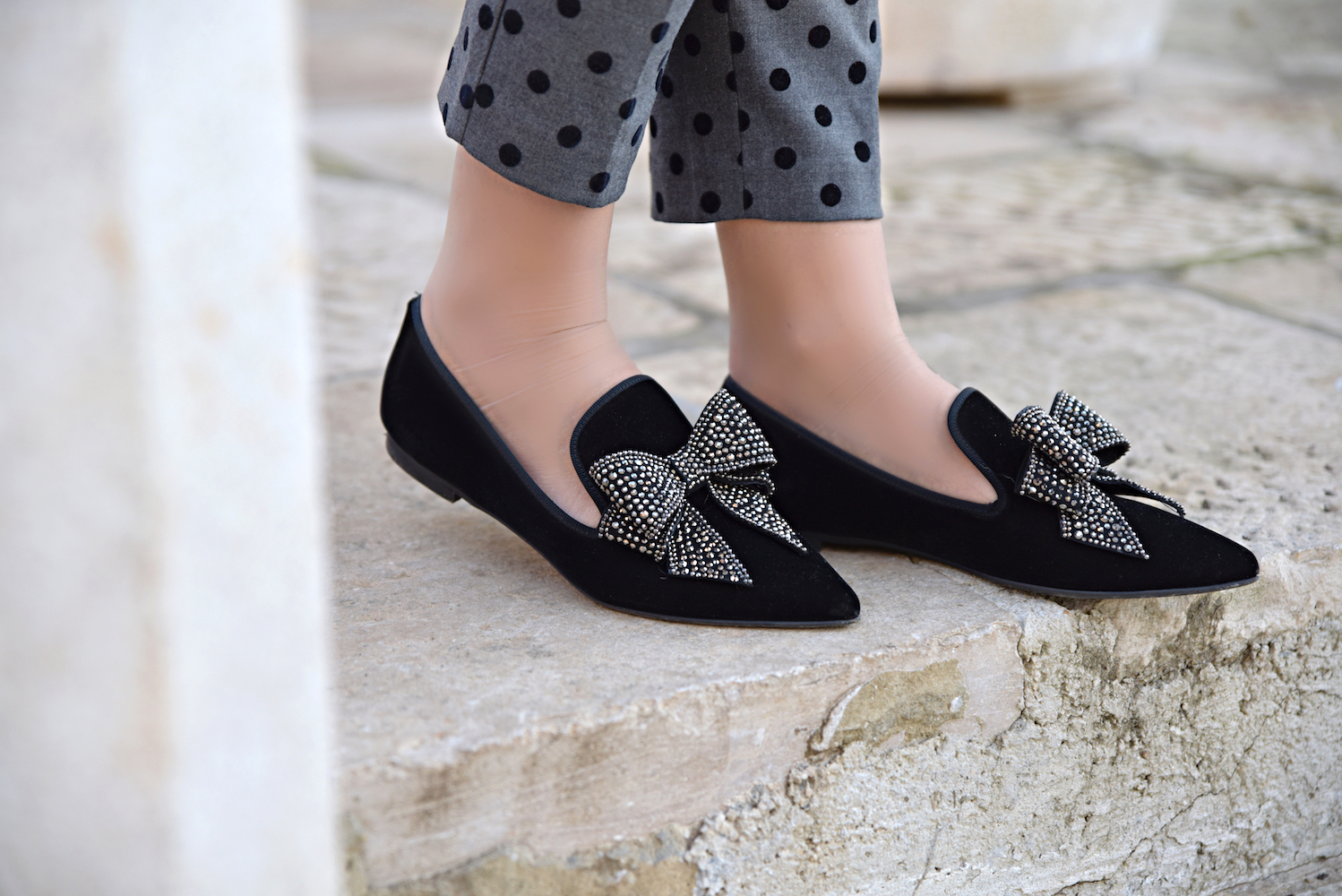I am not a big fan of black and the reason is simple; I don’t see why I have to wear total black combinations, when we have so many brilliant colours that, beside all, are able to donate you energy, power, happiness and more. But this time I decided to try a simple combination between black and grey, with a pair of comfy polkadot trousers and flat shoes. I guess it’s the last black style for this winter season, we are all waiting for the new, higher temperatures and as I can see, they are finally coming! Just to let you know, the color black affects the mind and body by helping to create an inconspicuous feeling, boosting confidence in appearance, increasing the sense of potential and possibility, or producing feelings of emptiness, gloom, or sadness. The color black can represent both the positive and the negative.