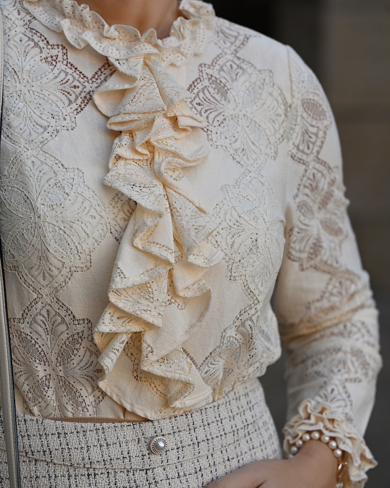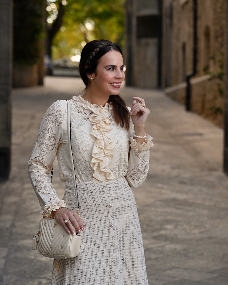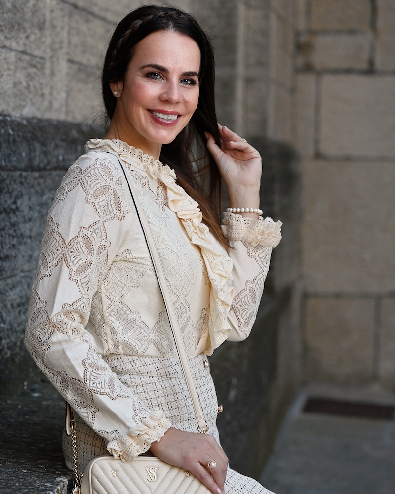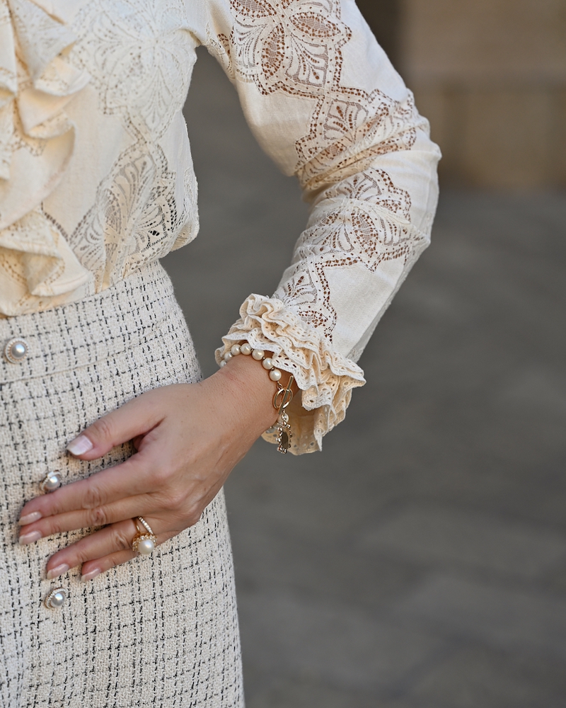 Today’s outfit is a celebration of timeless elegance and soft femininity. I’m wearing a bouclé skirt, refined and structured yet wonderfully comfortable, paired with a delicate lace blouse that adds a romantic and airy touch to the look. Everything comes in a creamy, neutral shade — a color that feels luminous, clean, and effortlessly sophisticated. This monochromatic choice allows the textures to truly stand out and creates a harmonious, polished effect. The finishing touch is the pearl details, subtle yet precious, bringing a hint of classic elegance to the outfit.It’s a look that doesn’t need much else to shine. Perfect for days when you want to feel feminine, put-together, and timeless, with grace expressed in the smallest details.