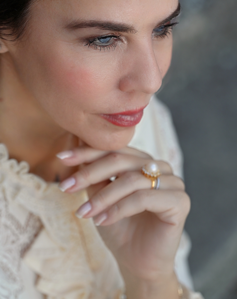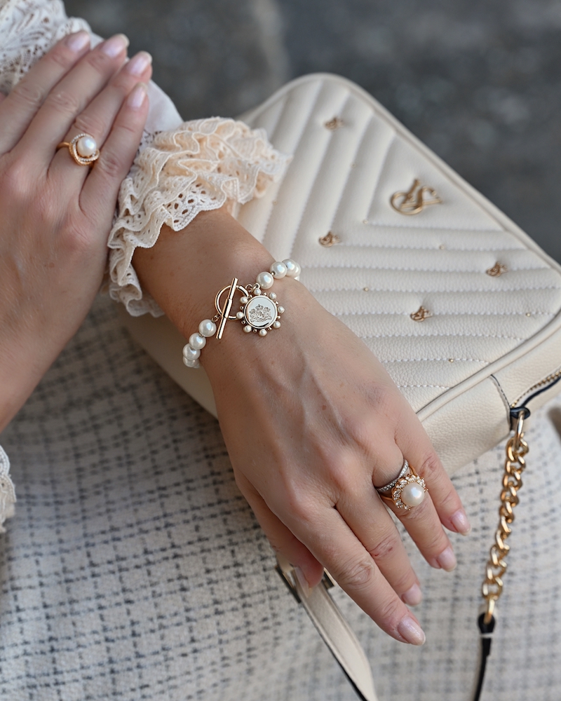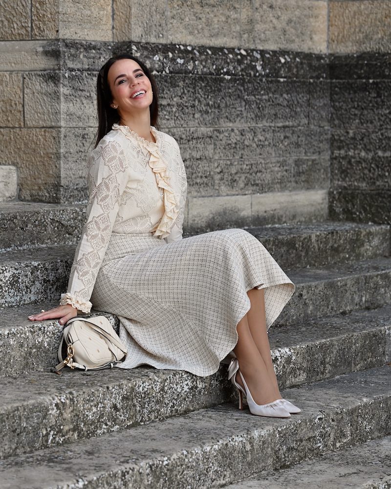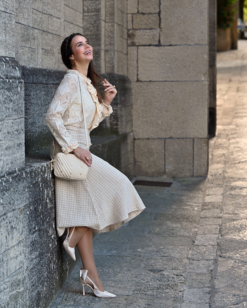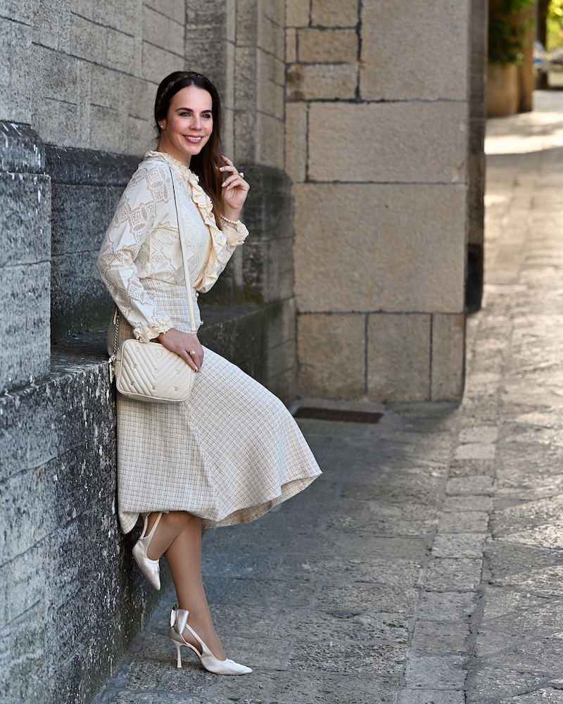 Today’s outfit is a celebration of timeless elegance and soft femininity. I’m wearing a bouclé skirt, refined and structured yet wonderfully comfortable, paired with a delicate lace blouse that adds a romantic and airy touch to the look. Everything comes in a creamy, neutral shade — a color that feels luminous, clean, and effortlessly sophisticated. This monochromatic choice allows the textures to truly stand out and creates a harmonious, polished effect. The finishing touch is the pearl details, subtle yet precious, bringing a hint of classic elegance to the outfit.It’s a look that doesn’t need much else to shine. Perfect for days when you want to feel feminine, put-together, and timeless, with grace expressed in the smallest details.