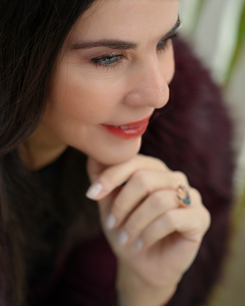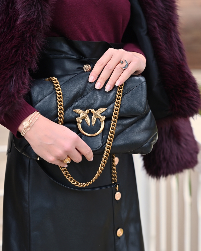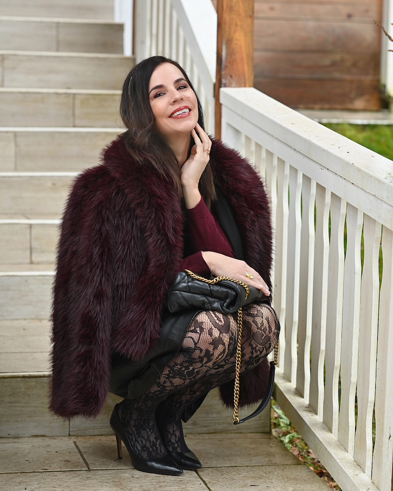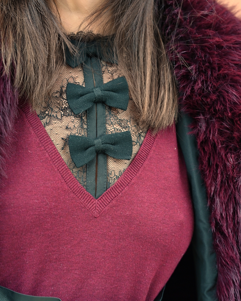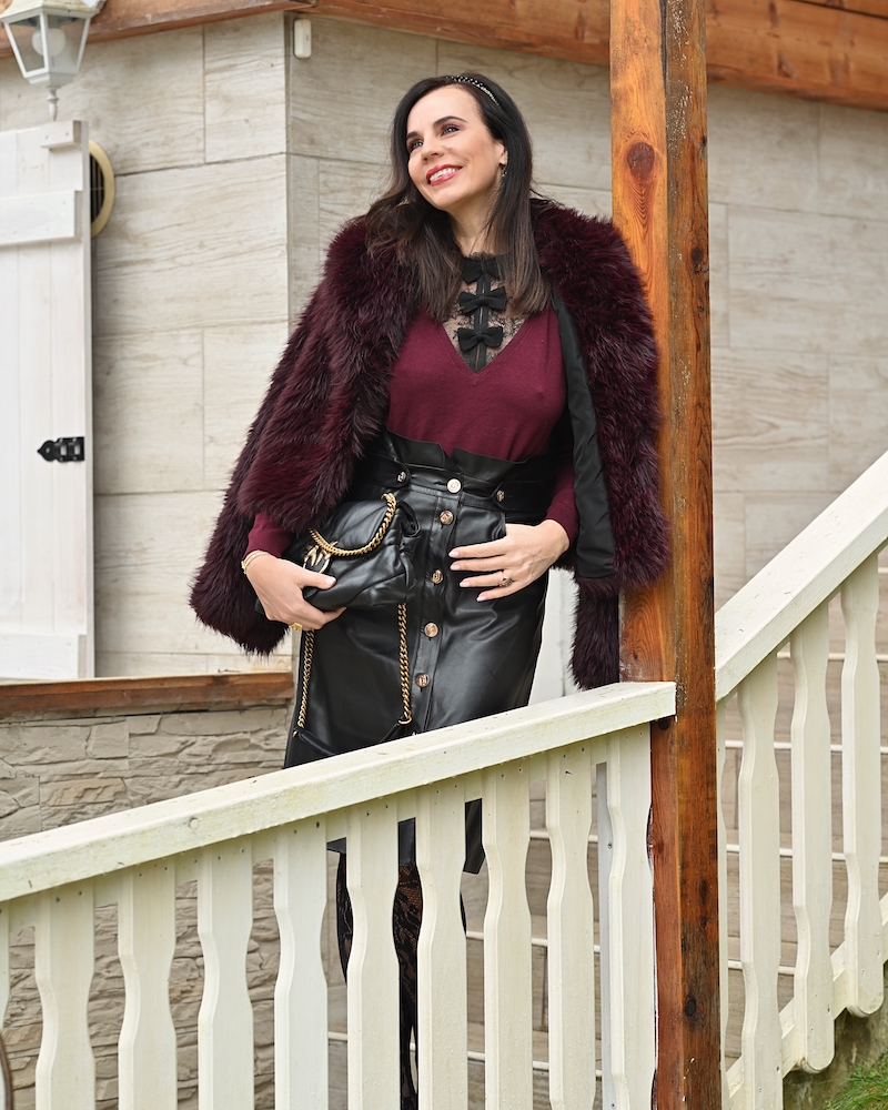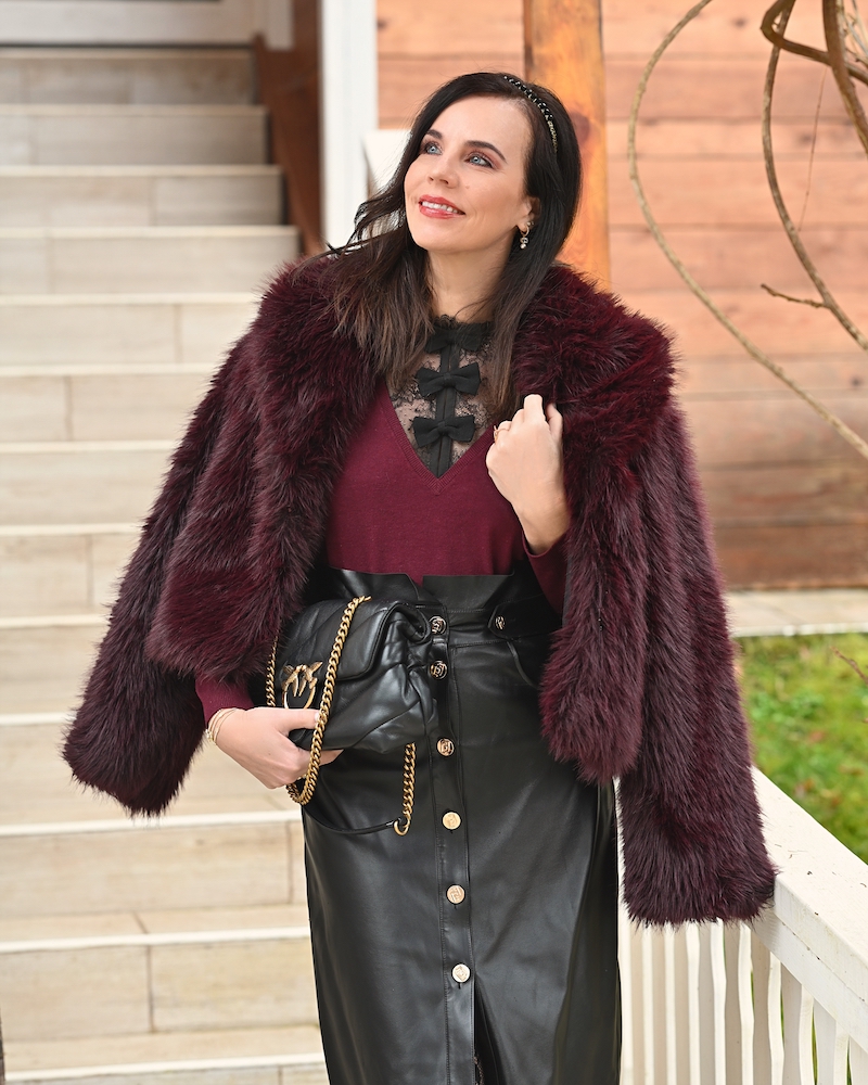 Today I’m wearing a combination of burgundy and black—a pairing that always feels elegant and slightly dramatic. I chose a black leather midi skirt for character, paired with a black lace top that adds femininity and a delicate touch.On top, I added a soft, furry jacket for warmth and texture. The mix of leather, lace, and cozy materials creates an autumn look that feels strong, elegant, and very feminine.