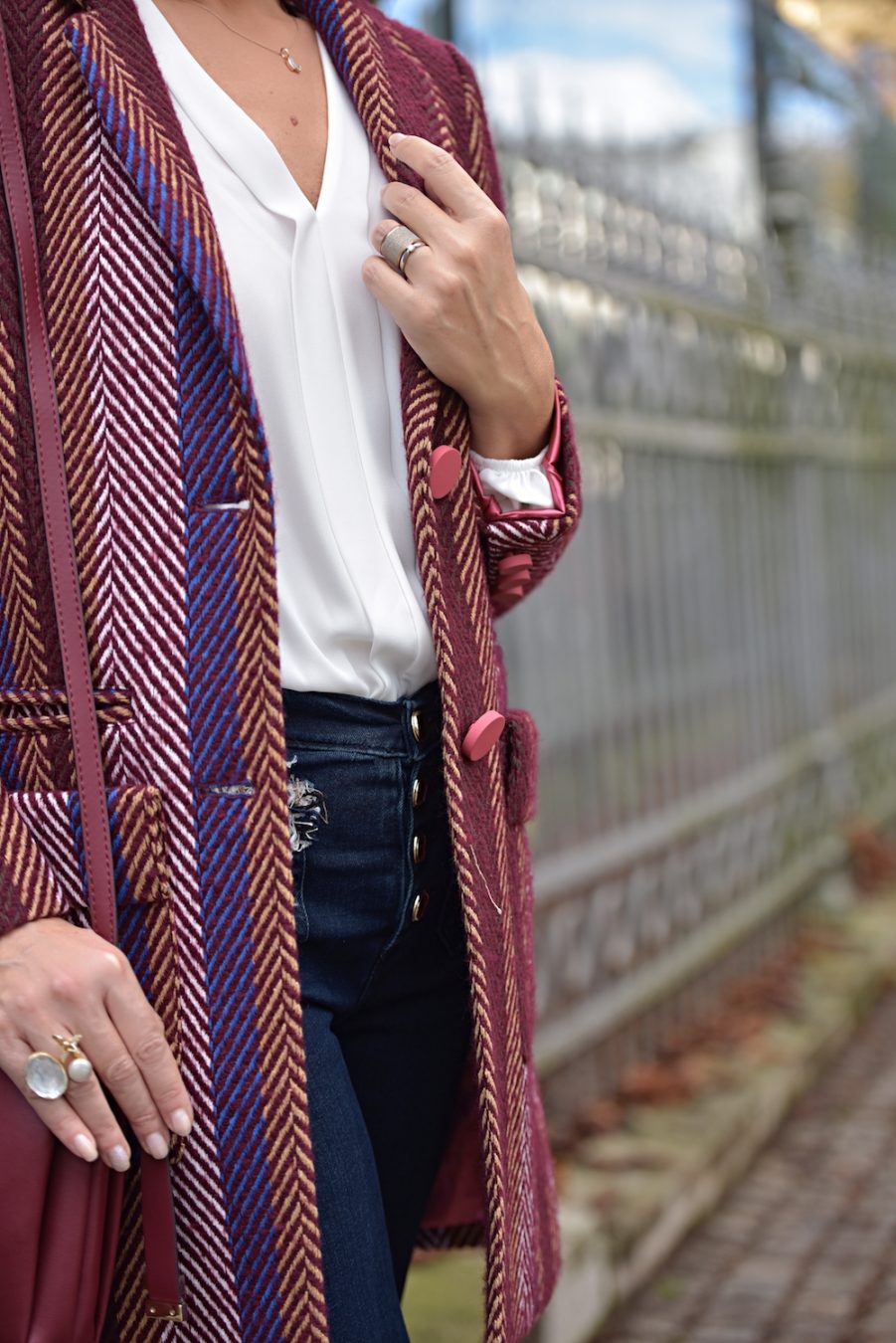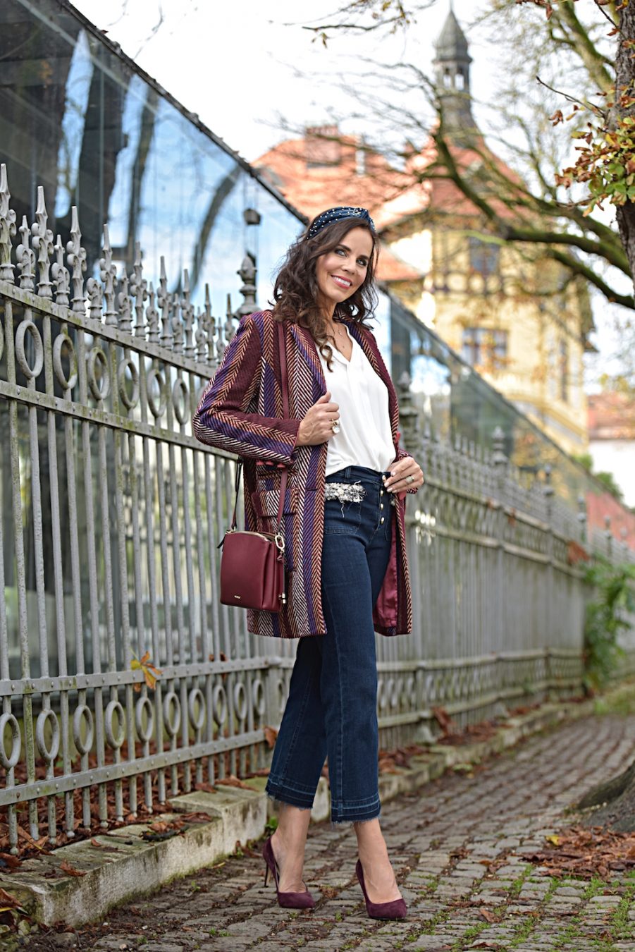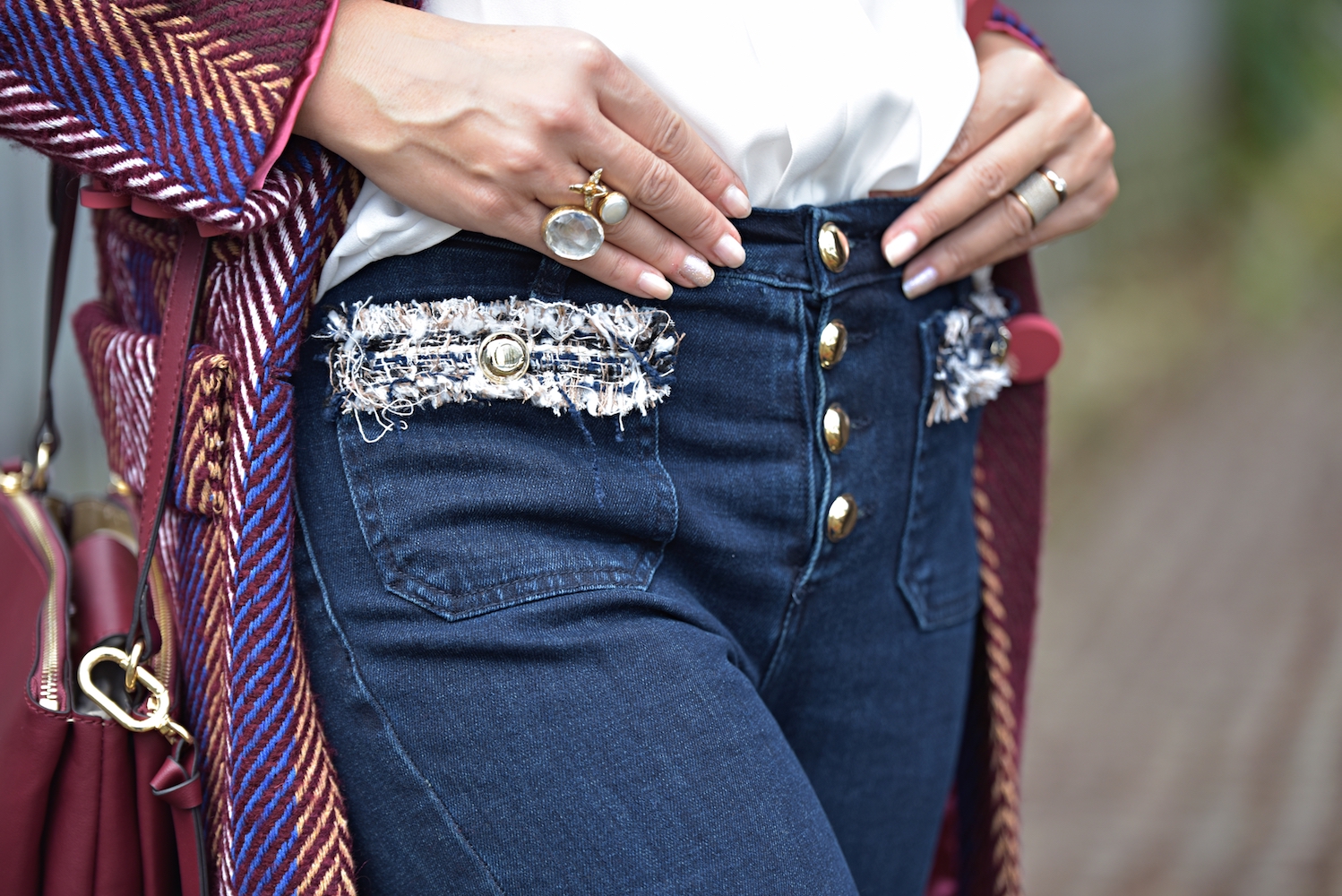 No matter what’s your skin color, height or body shape, this colour suits everyone. The great paradox of burgundy is the elegant and playful look. I think every lady should own at least a couple of burgundy color garments in her closet. You can wear it to different occasions, starting from simple walks on the town to fancy parties. In this case I decided to wear burgundy with a pair of tight jeans; I love the details on the pockets, super chic and soooo Chanel! The high waisted model is really feminine and comfy, so I use to wear it all day long, even with ballerinas or flat ankle boots.