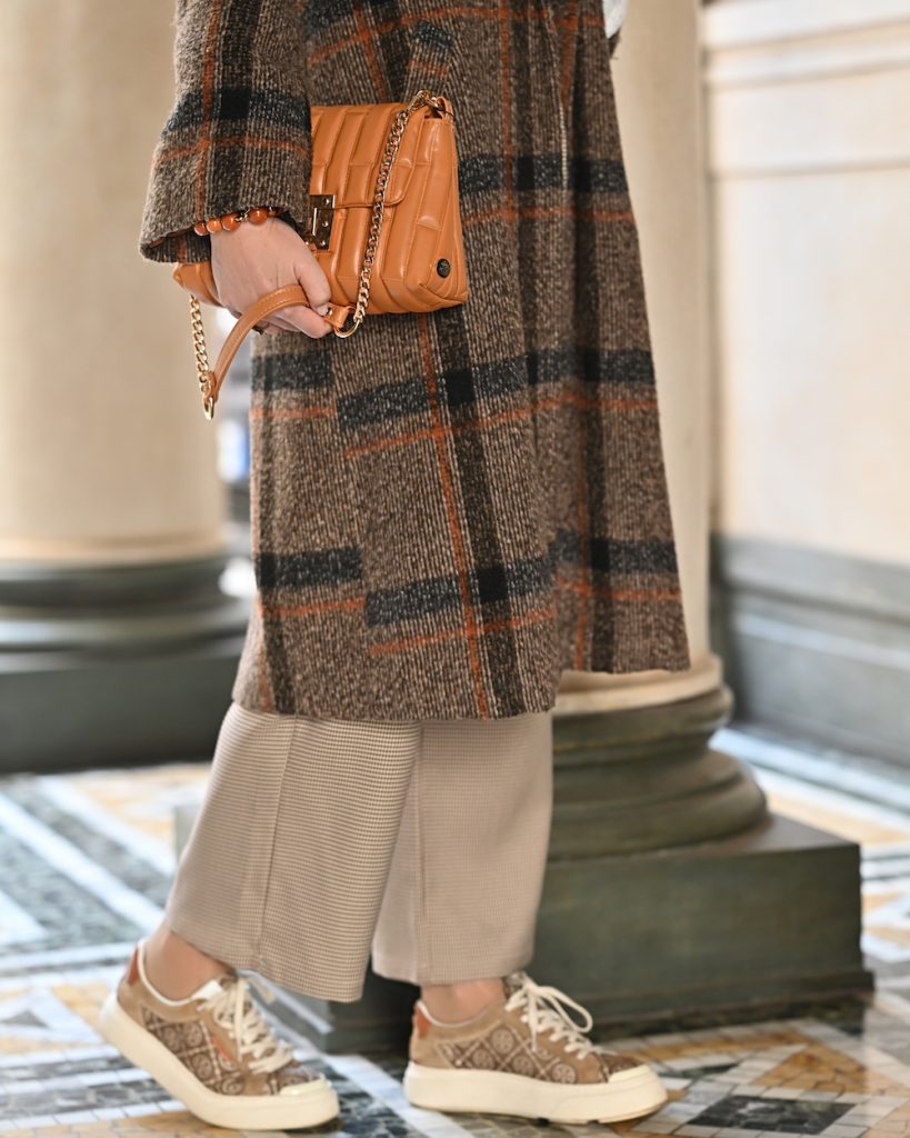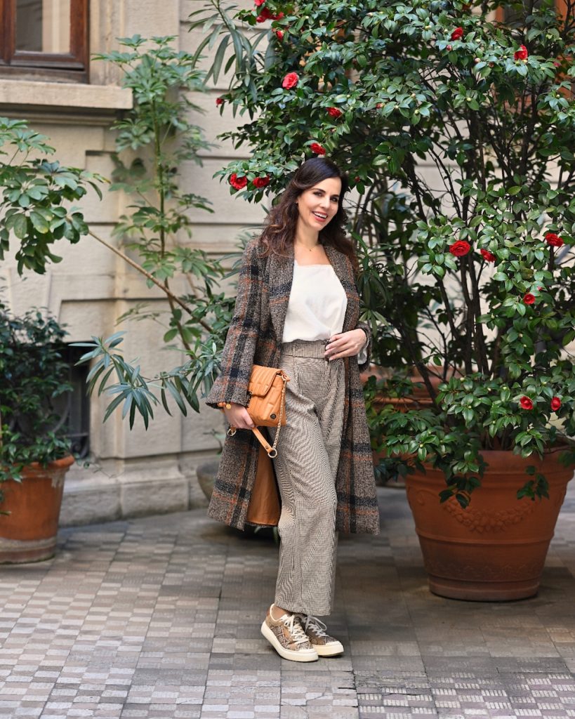 We are all looking for clothes in which we feel comfortable while keeping a harmonious, trendy and chic style. When I am in Milan for the fashion week I run all day long: the shows are in every part of the city, this time the weather was really wet and my tired legs were asking for comfort. One of the looks that I loved was the one I am presenting today: flat sneakers, comfy pants and a nice, romanic blouse. I have added a trendy coat and a big bag, to put inside whatever I need.