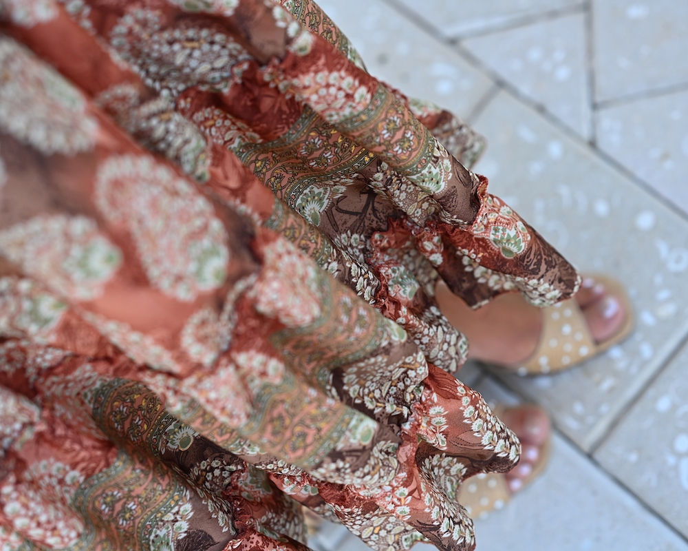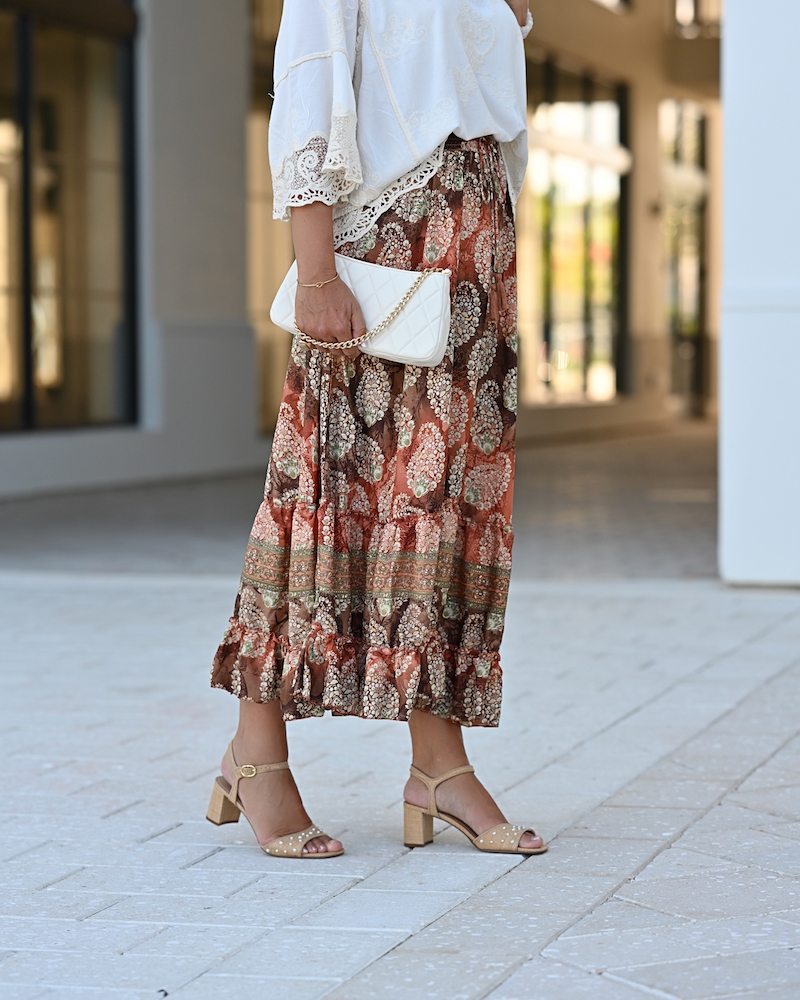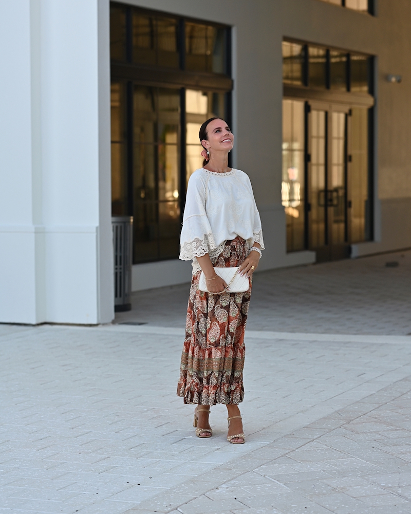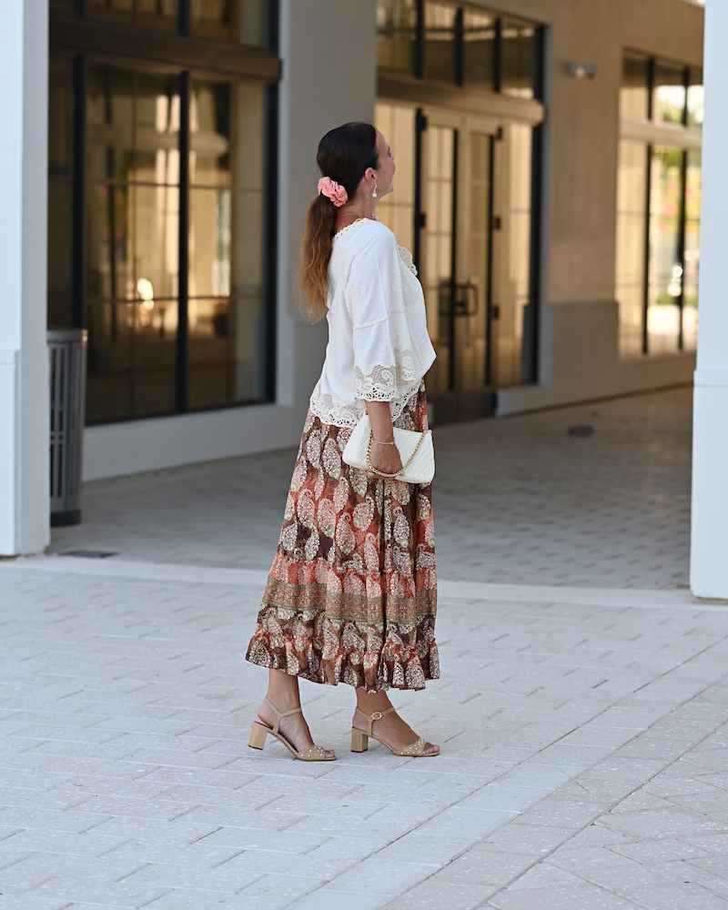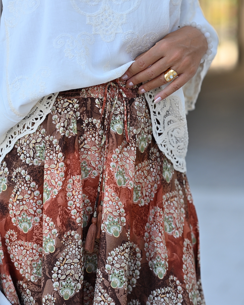 Fashion is at its best when it blends femininity with comfort. Today I chose a midi ruffled skirt in warm brown tones with a delicate print – a piece that moves gracefully with every step, adding a hint of romance.I paired it with a boho blouse, whose relaxed silhouette brings that sense of freedom I truly love. To complete the look, I went for mid-heeled shoes – elegant yet comfortable enough to wear all day. This is the style that feels most like me: feminine, wearable, and effortlessly mine.