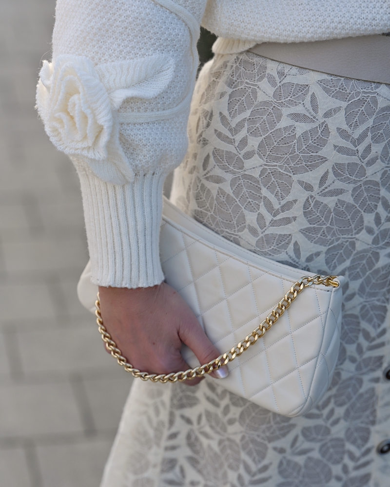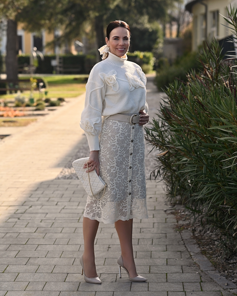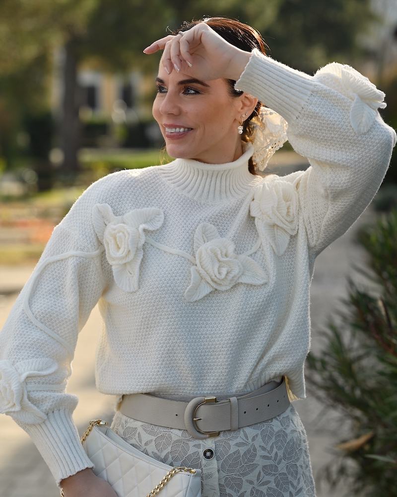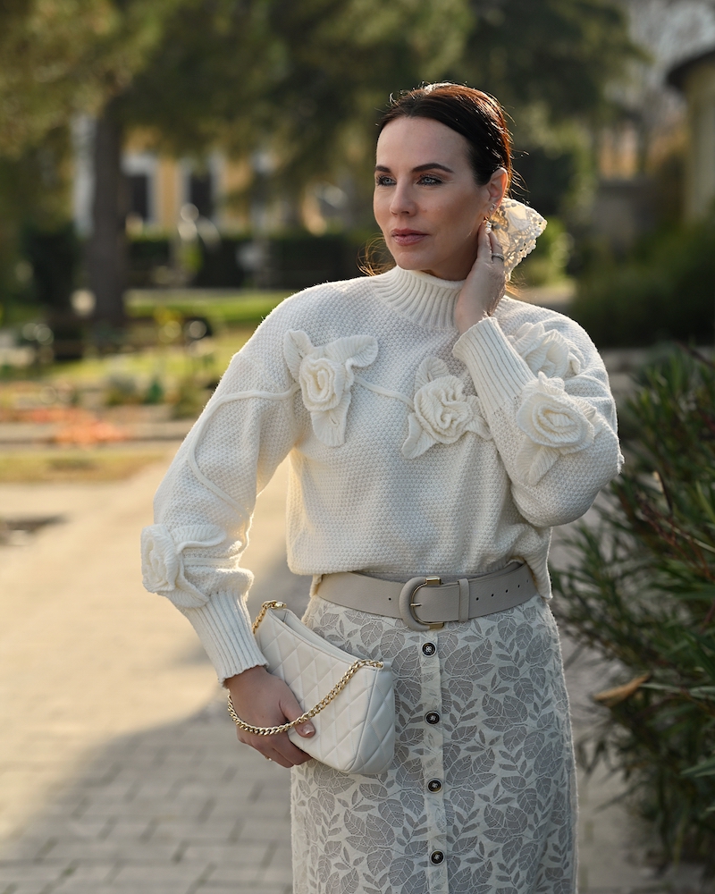 Today’s look is a celebration of femininity and thoughtful details that make an outfit truly special. The lace midi skirt adds a light, elegant touch and a timeless charm, while still feeling perfectly wearable for everyday moments. Paired with a knitted sweater adorned with roses, the look balances comfort and romance, blending textures in a soft and harmonious way. The bow in the hair is the final poetic detail, giving the outfit a dreamy, almost fairytale-like feel and highlighting a confident, personal sense of style. A look that proves how a few carefully chosen pieces are enough to feel beautiful, graceful, and completely yourself.