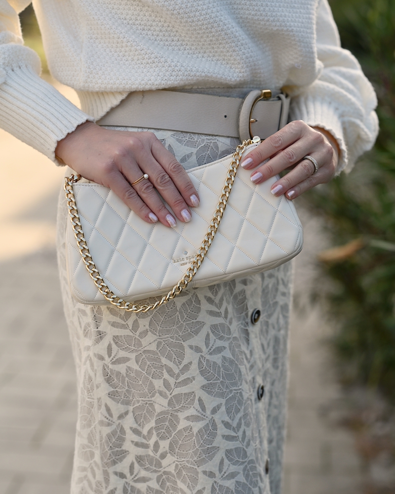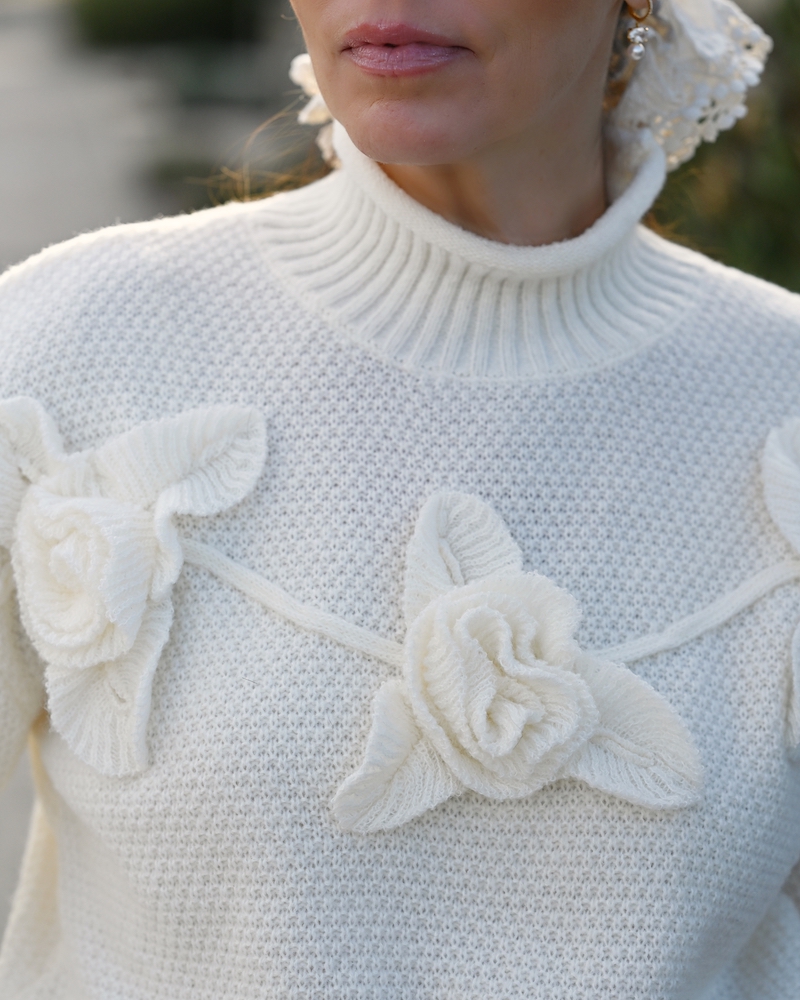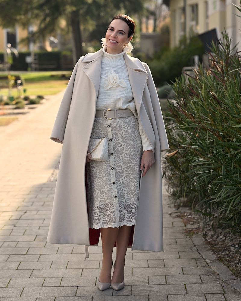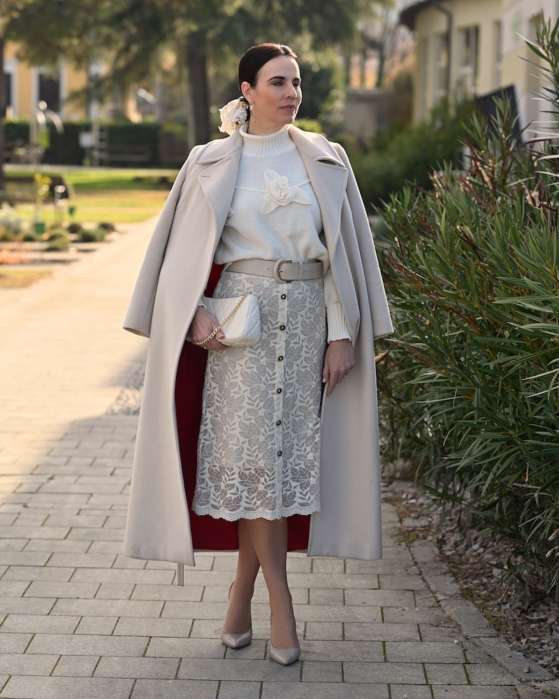 Today’s look is a celebration of femininity and thoughtful details that make an outfit truly special. The lace midi skirt adds a light, elegant touch and a timeless charm, while still feeling perfectly wearable for everyday moments. Paired with a knitted sweater adorned with roses, the look balances comfort and romance, blending textures in a soft and harmonious way. The bow in the hair is the final poetic detail, giving the outfit a dreamy, almost fairytale-like feel and highlighting a confident, personal sense of style. A look that proves how a few carefully chosen pieces are enough to feel beautiful, graceful, and completely yourself.