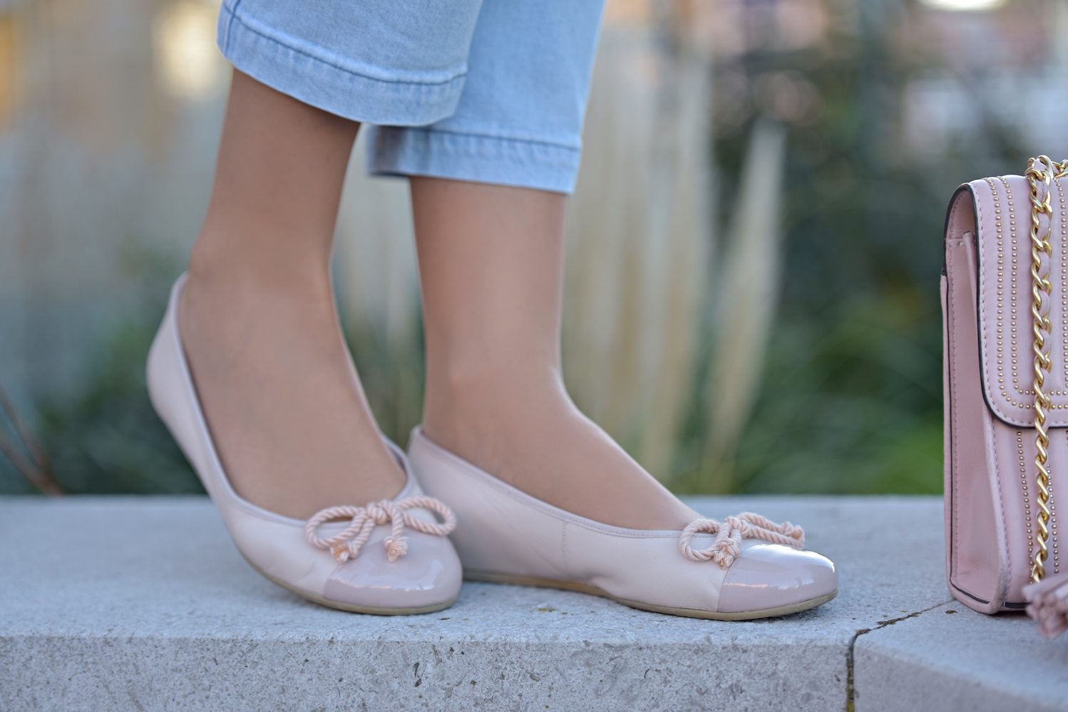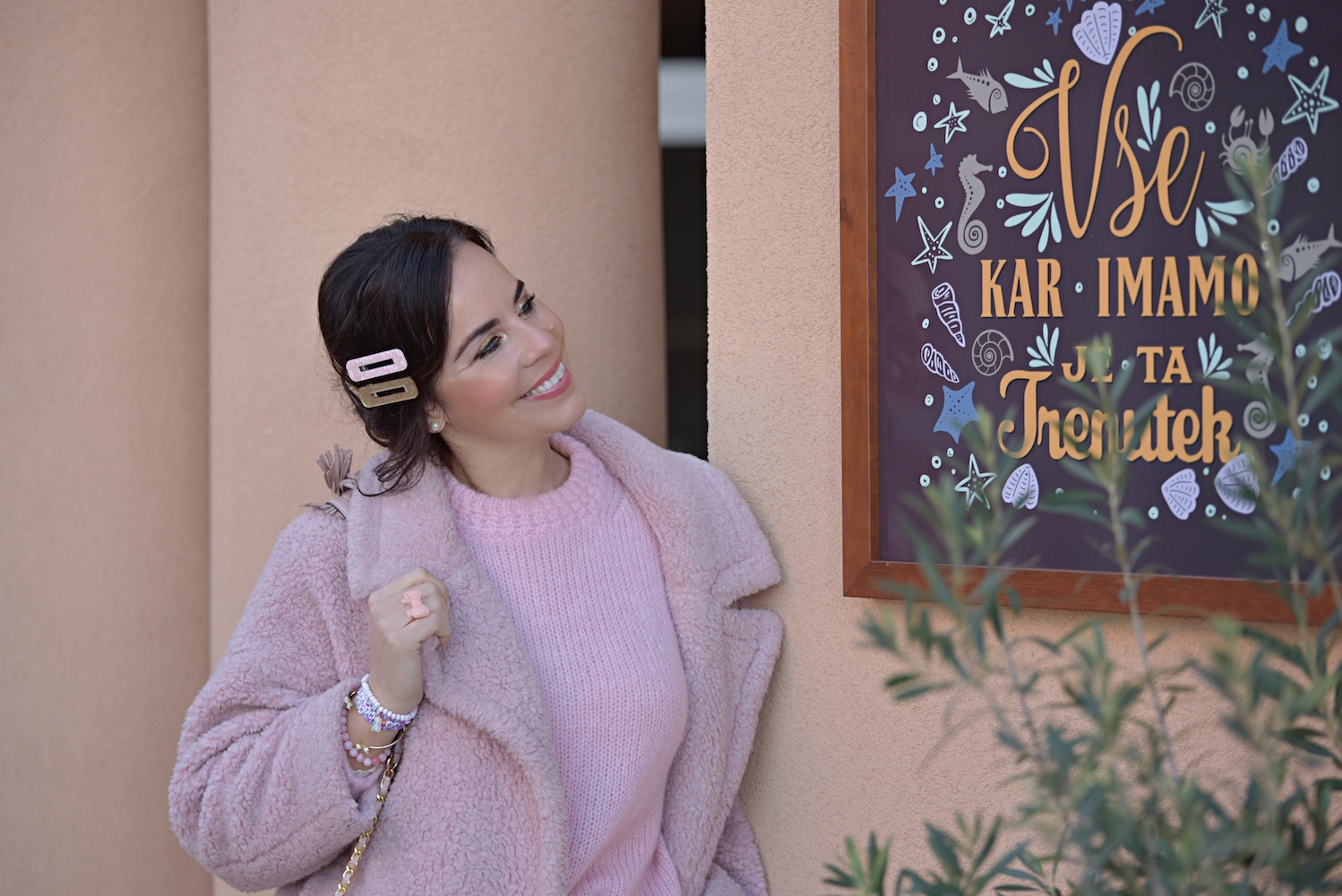 I always think pink! In my closet there are many pink items, the shades are of course different, because I love everything, from fuchsia to blush. I’ve noticed that the pink trend and pink outfits haven’t been limited to a specific shade, there are a lot of shades to choose from; bubble gum pink, salmon, fuchsia, raspberry and rose..There are many ways you can incorporate pink into your outfit with items that are not are not the clothing, like bags, shoes, hats and even makeup or bobby pins! So find the ones that suits you the most, but also don’t forget to experiment, you might end up finding your new favorite outfit color choice. My style is simple and clean: a high waisted pair of jeans, a nice pink knitwear, the teddy coat and a pair of pink ballerinas.