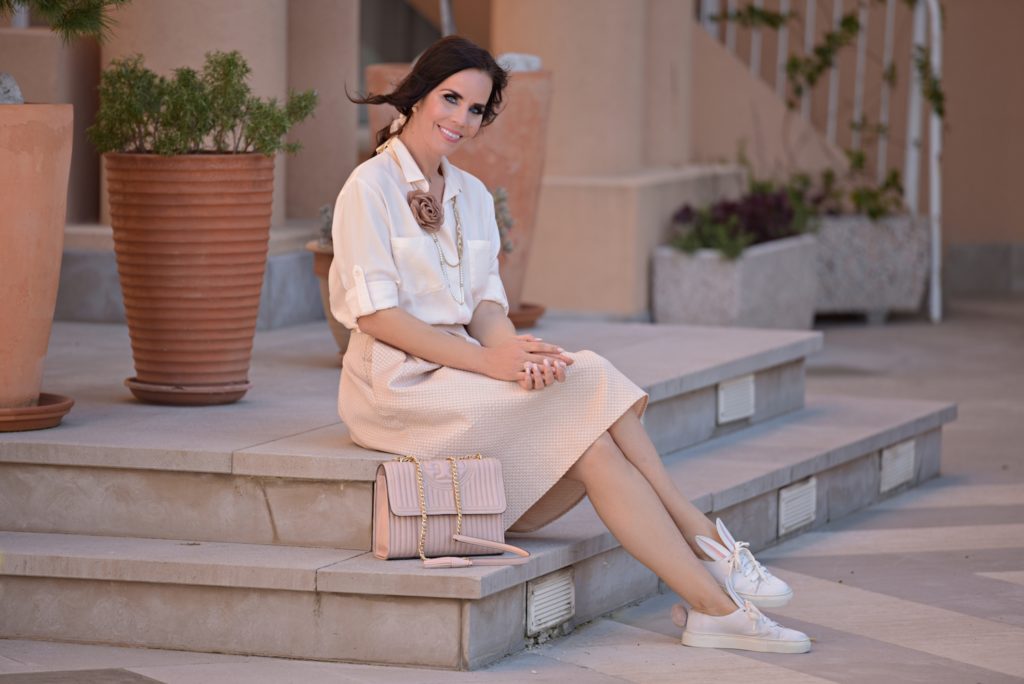 Yes, you can wear your sneakers outside of the gym, but there are rules! Okay, okay, I know some are eager to say that it’s just fine to mix the two, your gym shoes and your non-gym sneaks, but really … unless you are in a pinch, there are better choices to make than to wear your stinky running shoes to dinner. Personally, I love to be comfortable, especially when running around the city, so I would sneakers every day if I could. And by pairing sneakers with skirts, I’m able to wear them to work a lot more than I care to admit without anyone batting an eye. I am still very faithful to my lovely pastel colours and I love the midi length of the skirt. So here I am, on a super calm sunny day.