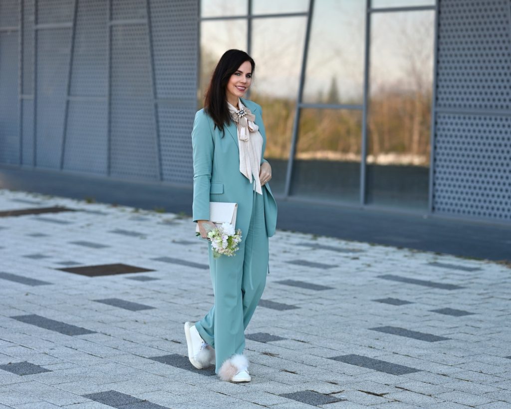 Here we go: the power of the suit that always works, but when i colors even more! When dressing for the office, it’s important to feel comfortable as you’ll be wearing these clothes all day. Therefore, pants often make a good choice as they’re typically easier to move and sit down in than fitted dresses and skirts. If you’ve been in your job a while, you’ll have a better understanding of what works for your office. As such, you can inject personality into your wardrobe without worrying about appearing underdressed. Instead of the classic black, blue navy or brown suit, opt for a nice color, a bold one that will always make you feel better. Mine choice is mint with a bit of baby blue, a very fresh shade that will take me straight to spring.