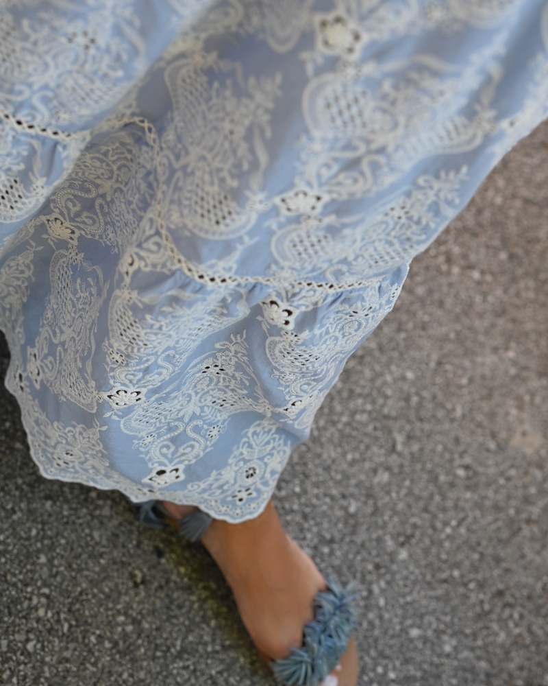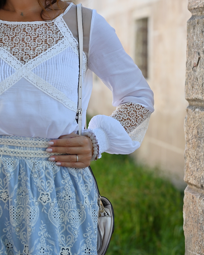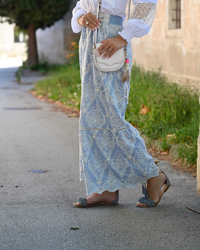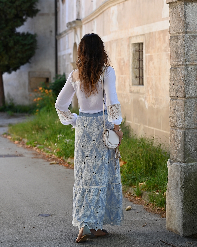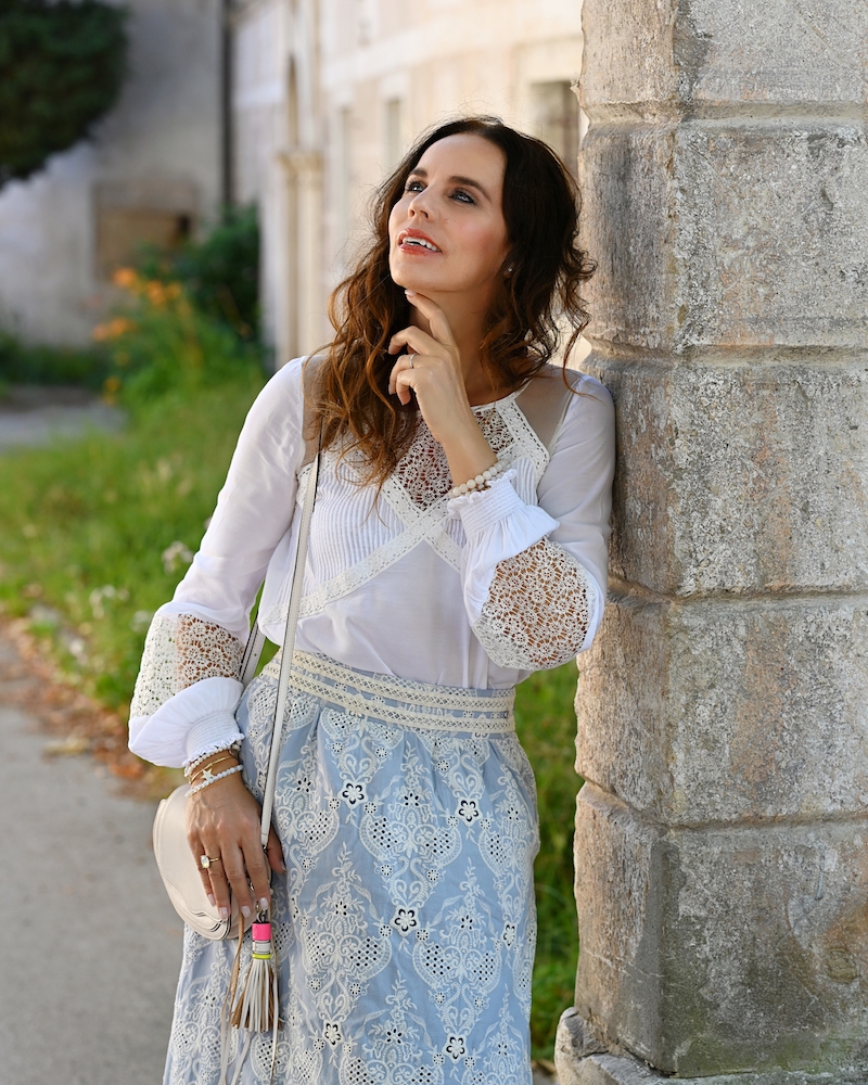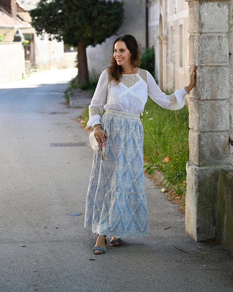 The long skirt is a timeless piece, loved for its natural elegance and the freedom it brings. Today I’m wearing a light blue long skirt with ethnic details and lace, flowing gracefully with every movement. On top, a white lace blouse adds a soft romantic touch, while flat sandals complete the look. It’s a very ethno-inspired outfit – relaxed, feminine, and perfect for vacation days. For me, the ethno style has always carried a deeper meaning. It’s a blend of artistry, tradition, and a connection to nature. Wearing a skirt like this feels like wrapping yourself in creative, light, and soulful energy. It doesn’t follow fashion trends – it tells its own story. Ideal for slow, sun-kissed days, when you can let go of the rush and simply be – more present, more at ease, more connected with yourself and the world. Fashion, at its best, is exactly that: a way to feel free, beautiful, and aligned with your own rhythm.