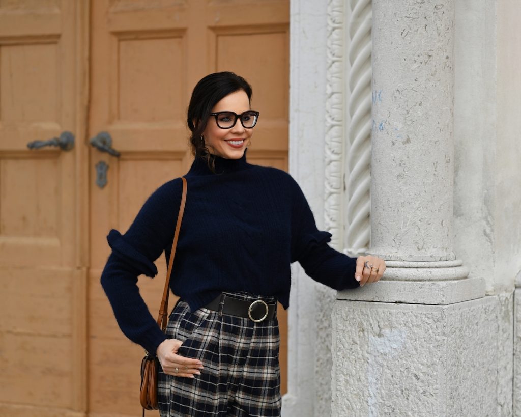 My style is as follows: Vichy pants and knitwear Motivi, shoes Guess, bag Chloé, coat SOliver, glasses Tom Ford, rings Asos, Accessorize and Swarovski.