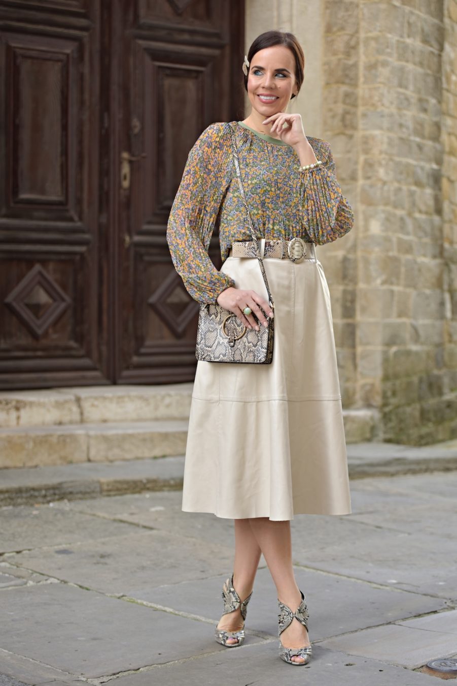 Leather is going to be a huge trend this year. Oftentimes, when we think of adding leather pieces to our wardrobes, moto jackets are one of the first things to pop up. However, I think the leather midi skirt is a really good decision, elegant, sober and chic. You can wear it with a simple white tee, or choose the perfect blouse, add a blazer or a long cardigan, wear heels or flats and you will always be in style. In this case I love the beige colour, it is a true spring shade, so I played a little with some contrasts as flowers and animal print. This is the result.