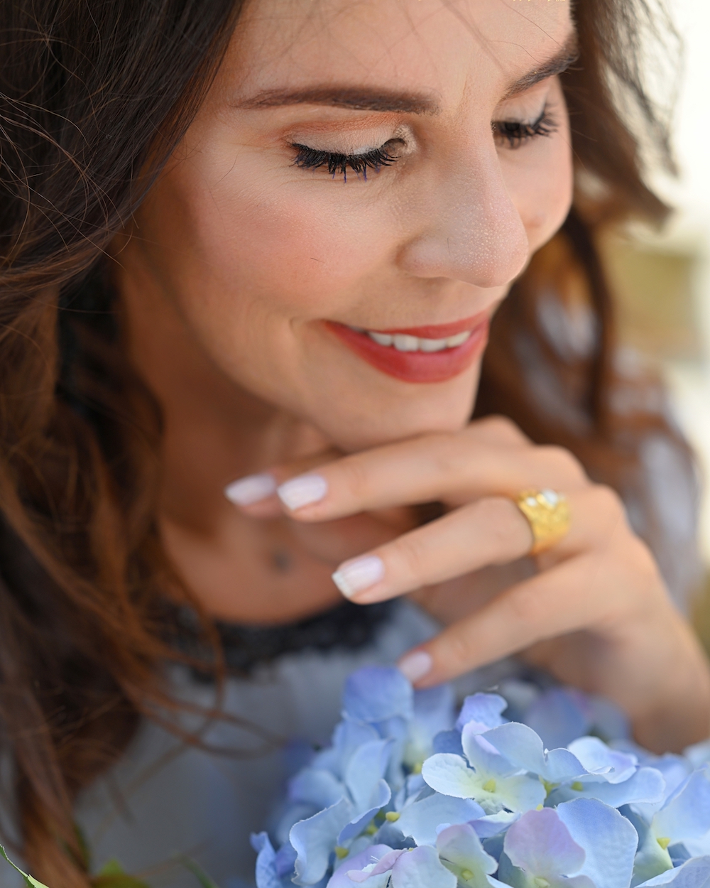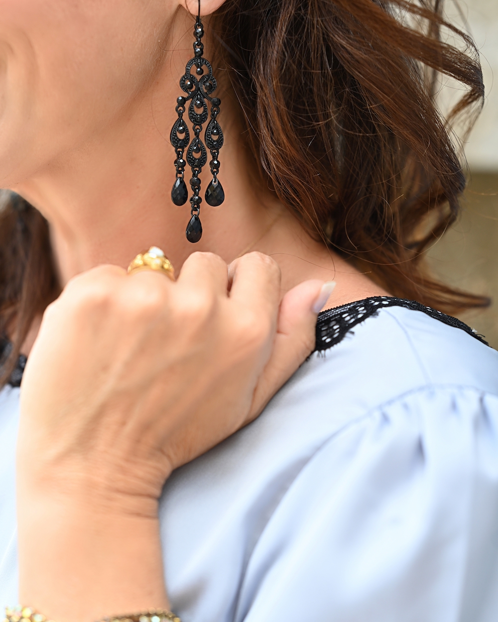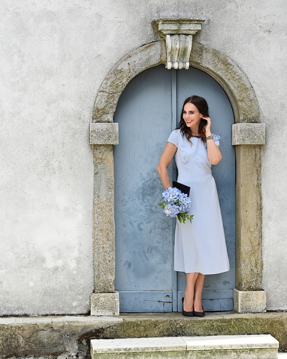 Happy Monday, dear readers! This is how I am starting the week, with a delicate and super romantic light blue dress with a bit of black lace. I am always in love with pastels, they are the best choice for summer, you can go to a wedding, a floral party or on holidays. The midi dress wants high heels, so I opted for a nice pair of black, glitter shoes (they always make me feel like a princess!). Also the jewelry is elegant and feminine, with some black stones form Elizabeth Cole. This style is so me, that I could wear it all day long!