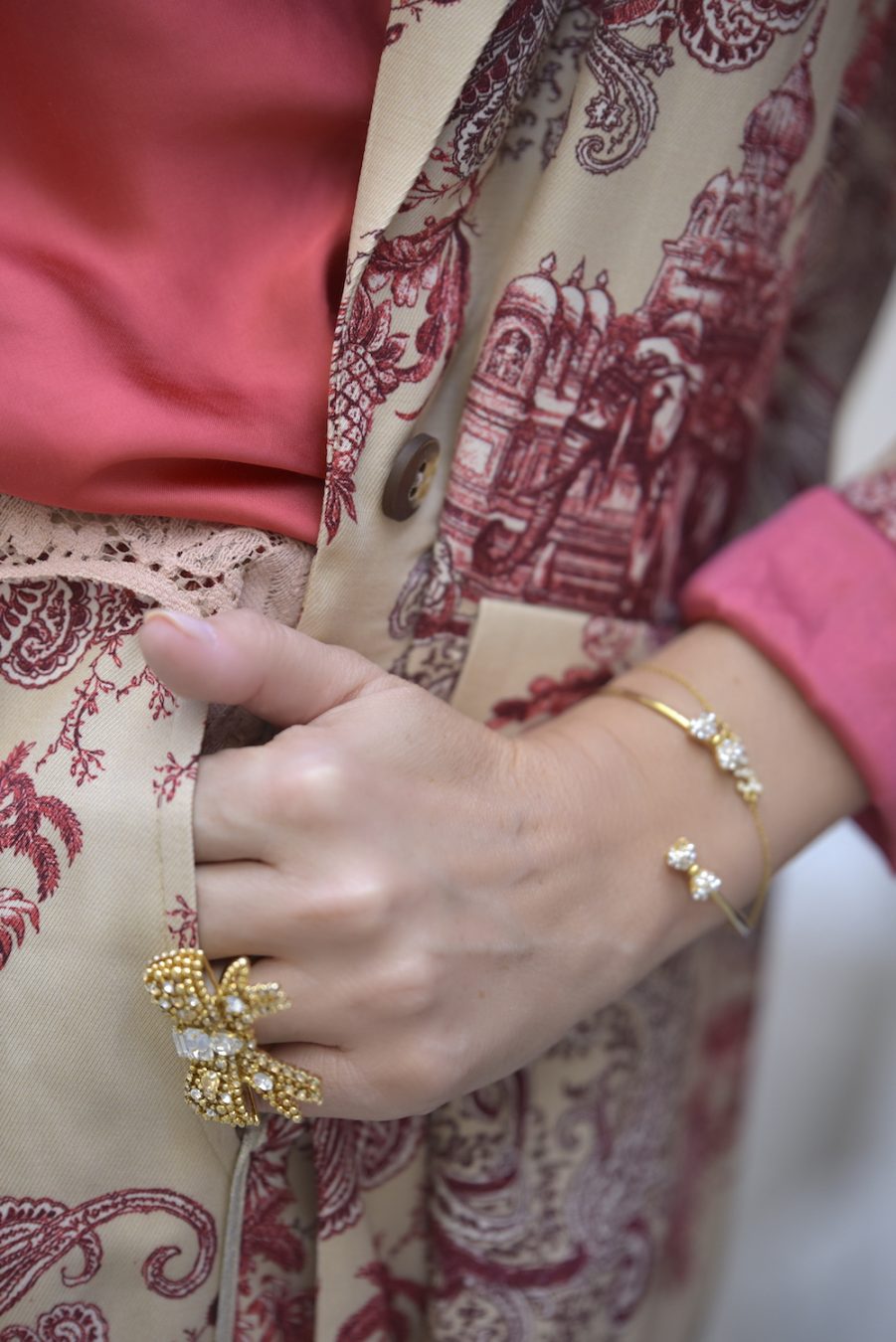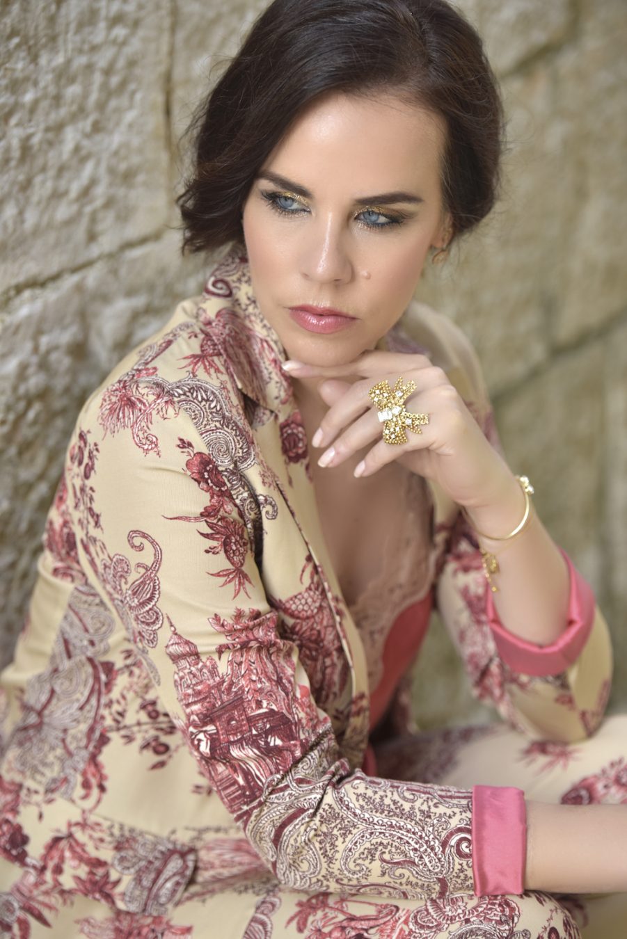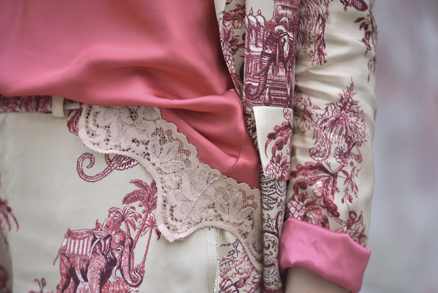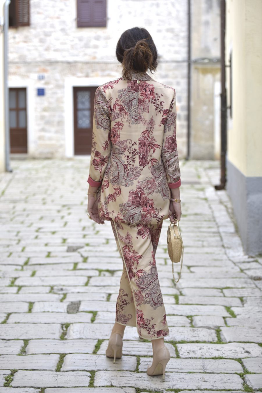 The oriental theme has crept back into the fashion spotlight over the past three fashion seasons, securing itself prime position as one of the hottest trends of the last years. Personally I like the Chinese-inspired silhouettes in colourful florals adorned with embroidery, feathering, mandarin collars, contrasting binding and silk fringing. Ornate florals intricately embroidered in rich scarlet red, jade green and golden mandarin hues are reworked into offbeat Asian blooms. The suit I am wearing today is just fresh, elegant and modern to become a must have piece of this summer. And I already adore it! I combined it with a silk top in the same shades and I own the same version of the slip on dress, which is amazing as well. The return of the palazzo-type drawstring pant and piped-silk-shirt combination to high fashion, otherwise known as “night suits” or pyjama dressing, has legitimised comfortable sleepwear as a day and/or evening option.