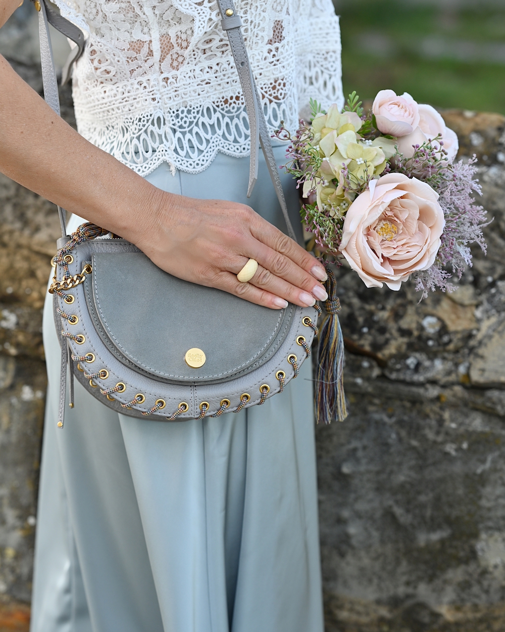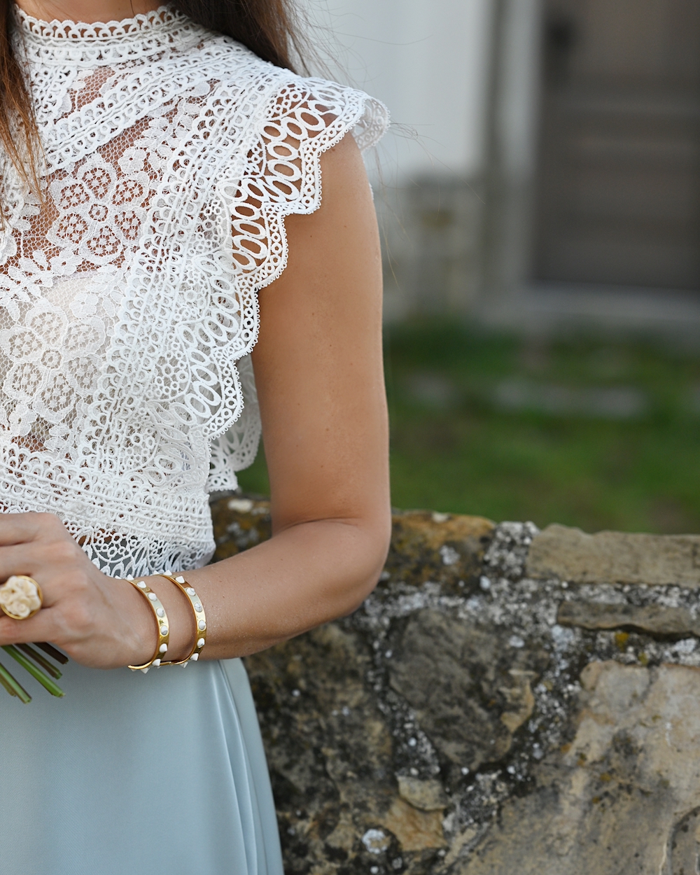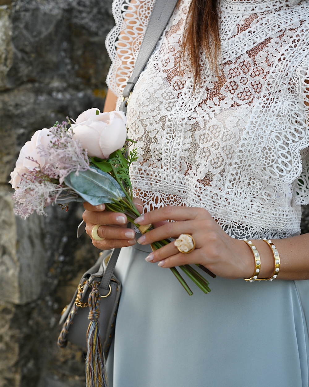 There’s a reason why everyone who I adore style-wise is wearing them. The satin skirt is super chic, yet comfortable, you can wear it with flat sandals or sneakers, or choose a nice pair of high heels. It comes in so many different shades, so you really don’t have to stop to the black or white one. Plus you can wear it also in winter and fall, with some cozy, nice knitwear. Usually the design comes with a handy elasticated waistband and ‘just below the knee’ length, in a myriad of jewel-tone and earthy shades and patterns. Mine is light blue with a bit of grey, really elegant and nice to pair with the lace top.