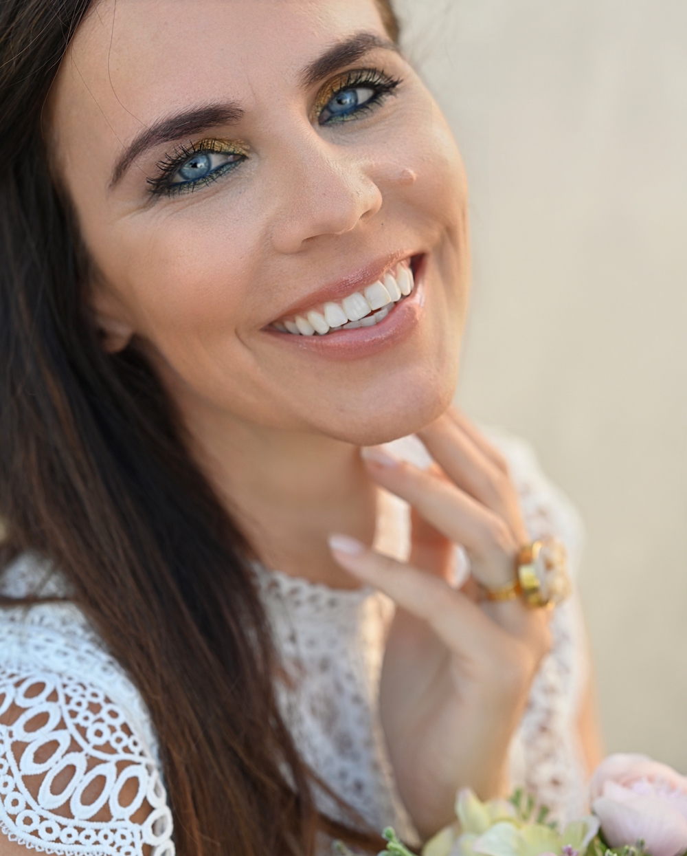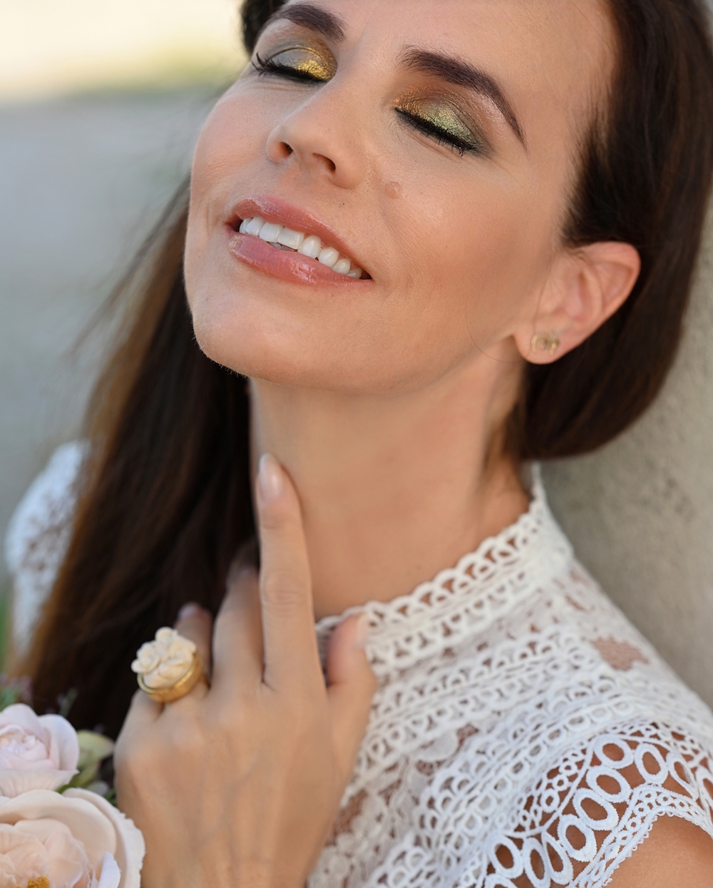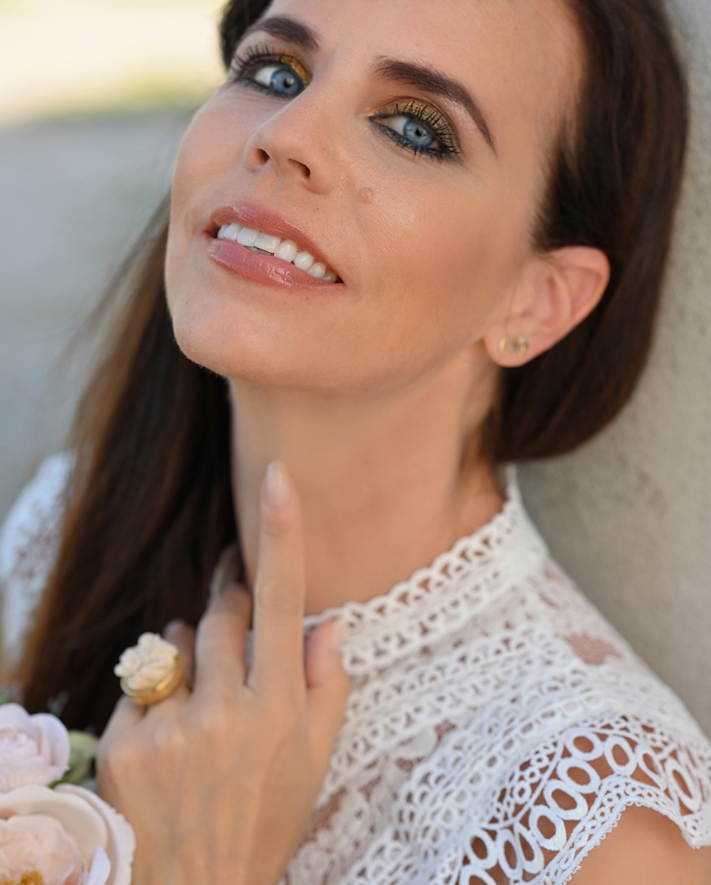 There’s a reason why everyone who I adore style-wise is wearing them. The satin skirt is super chic, yet comfortable, you can wear it with flat sandals or sneakers, or choose a nice pair of high heels. It comes in so many different shades, so you really don’t have to stop to the black or white one. Plus you can wear it also in winter and fall, with some cozy, nice knitwear. Usually the design comes with a handy elasticated waistband and ‘just below the knee’ length, in a myriad of jewel-tone and earthy shades and patterns. Mine is light blue with a bit of grey, really elegant and nice to pair with the lace top.