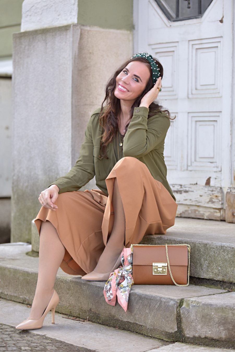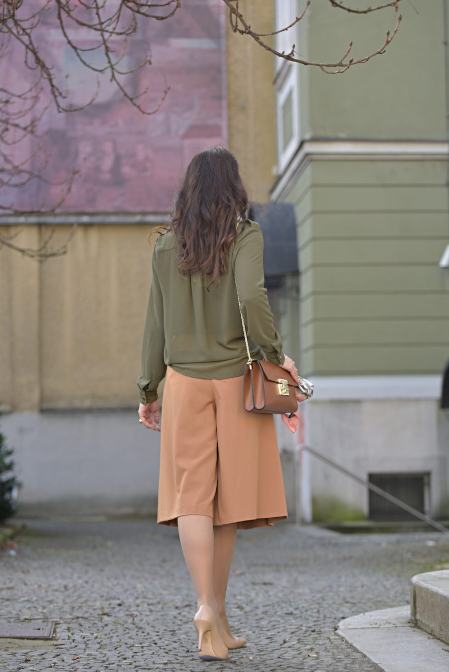 Culottes can easily be unflattering and make you look shorter or wider. The trick to wearing culottes is to pick the right top; then treat them like any old pair of pants. You want a fitted shirt that’s cropped or that you can tuck in to balance out the wider silhouette of the pants. The newest and most elegant way to work this trend is to choose short culottes with a flowy look and feel that are quite full in the leg. Think of women’s culottes like a swingy skirt, but with a modern twist. These feminine brown culottes are exactly what I’m talking about. I combined them with a bit of green military and a super light blouse. High heels are a must have, otherwise your leg will look shorter!