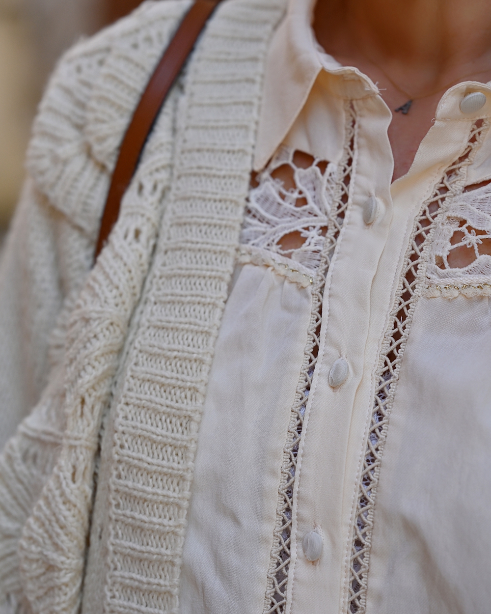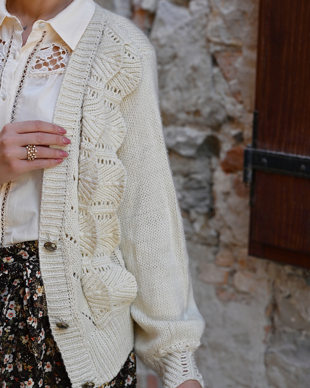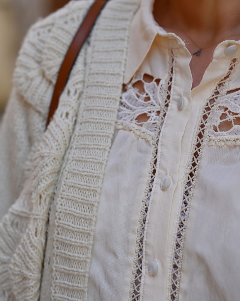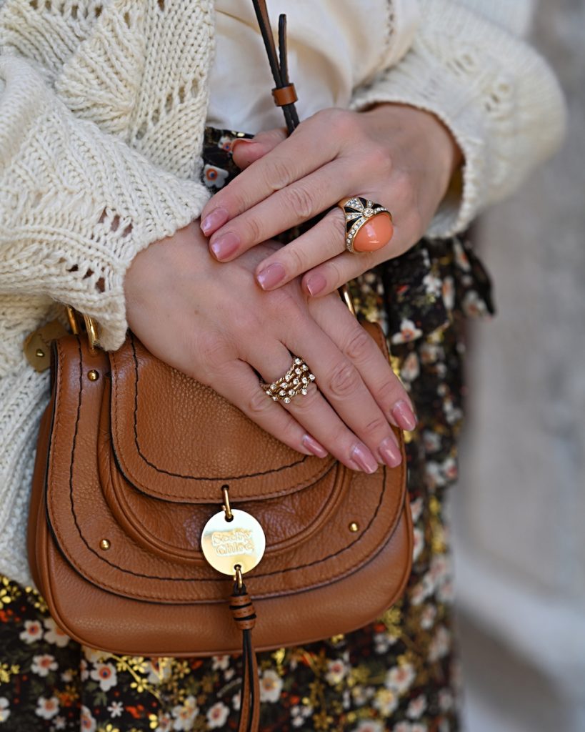 My style is as follows: shorts, blouse and knitwear Meisie, shoes Guess, bag Chloé, orange ring Kenneth Jay Lane.