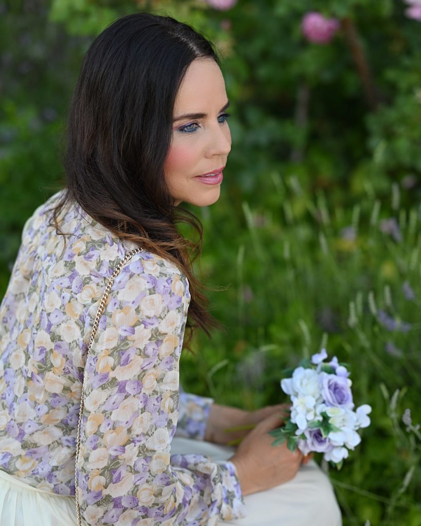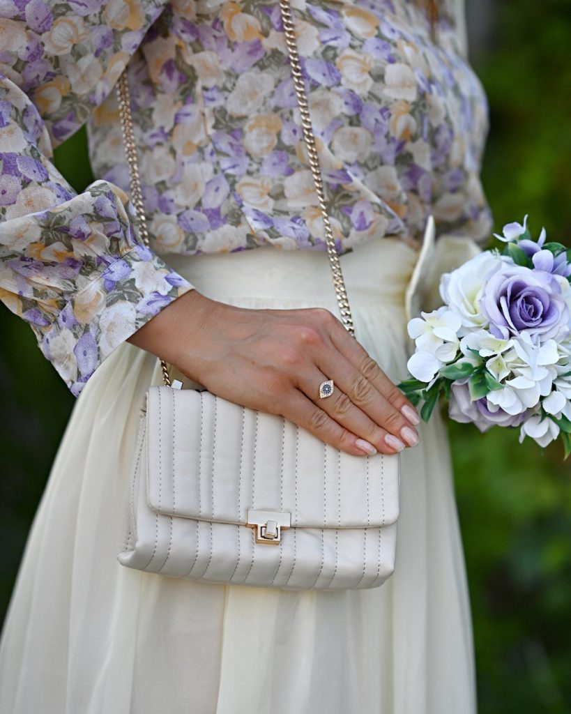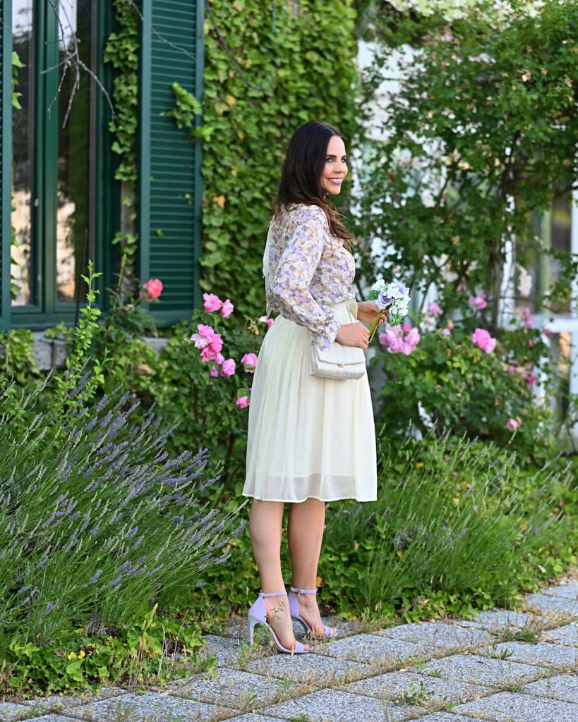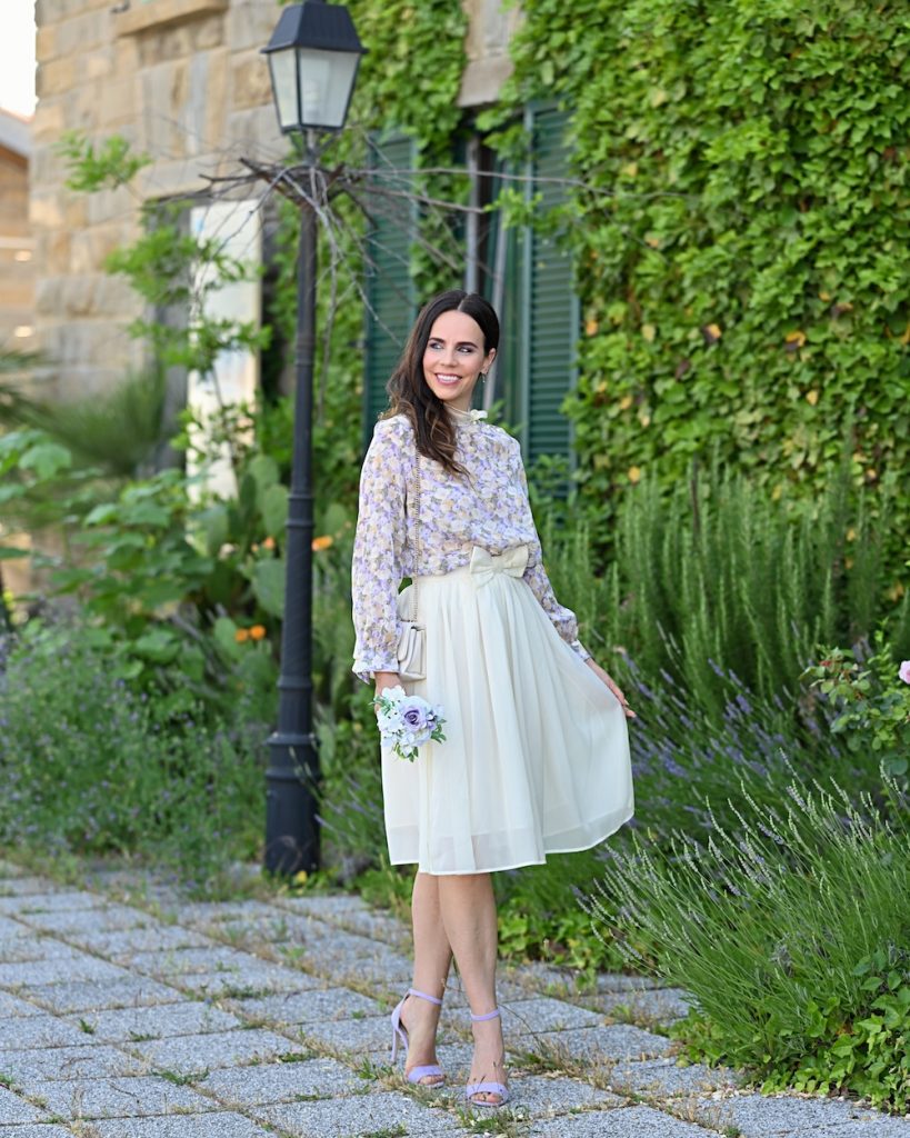 Here we go with another combination that I adore. Romantic and feminine, with a big bow on the skirt and some amazing small flowers on the shirt. Summer colors are here and they are so fresh and wearable: lavanda-violet, white and beige, everything goes together and creates a perfect harmony. Secondly, let’s talk about the bow; we can see them everywhere, even in our heads, they are nice and romantic, a good choice for a gentle summer. The A line bow skirt is really special to me, I wear it even with sneakers or super flat ballerinas and it always looks great. So, here we go with a summer, special style: I hope you will like it.