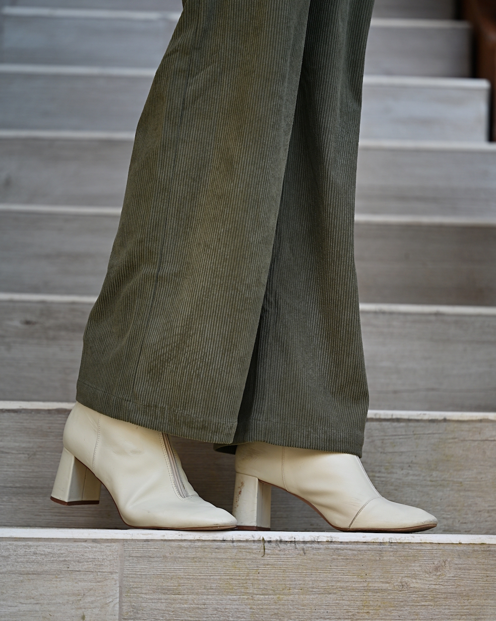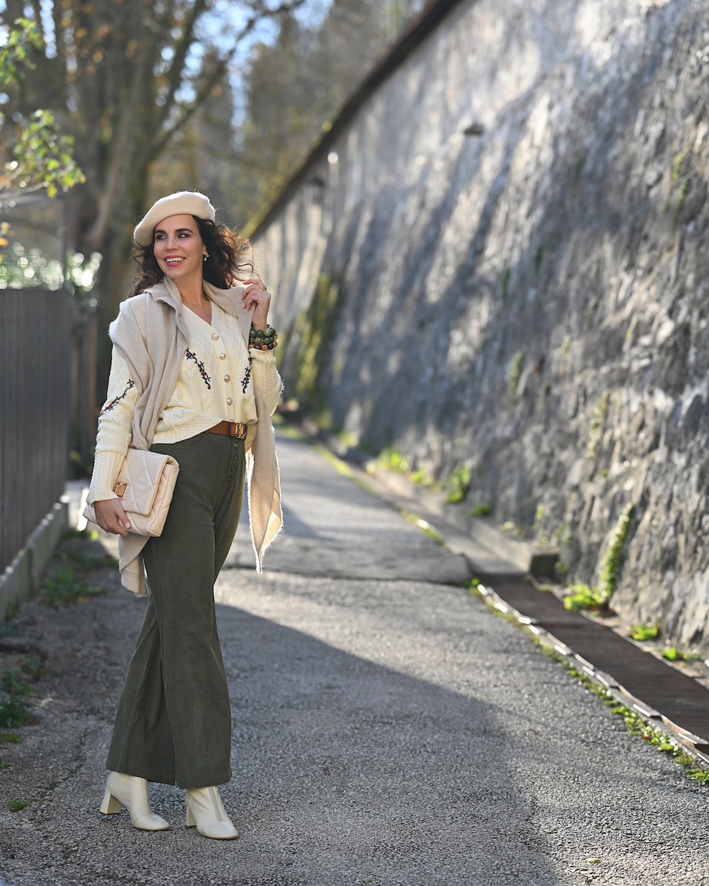 Velvet is one of the most flattering materials. First of all, velvet is soft and very warm. You can also find it very useful for cold winter days. You know those moments when you want to feel very cozy and warm, but still be very stylish. Velvet pants can always provide you that. At the same time, you will feel comfortable and look so trendy, even when the temperature hits zero. This model of pants is pretty easy to wear: I like the green shade and loose fit for a comfortable wear. Plus the knitwear, so cozy and romantic with the tiny flowers. I have added a basque, I just love it and it feels like the new “must have” deal for the cold season.