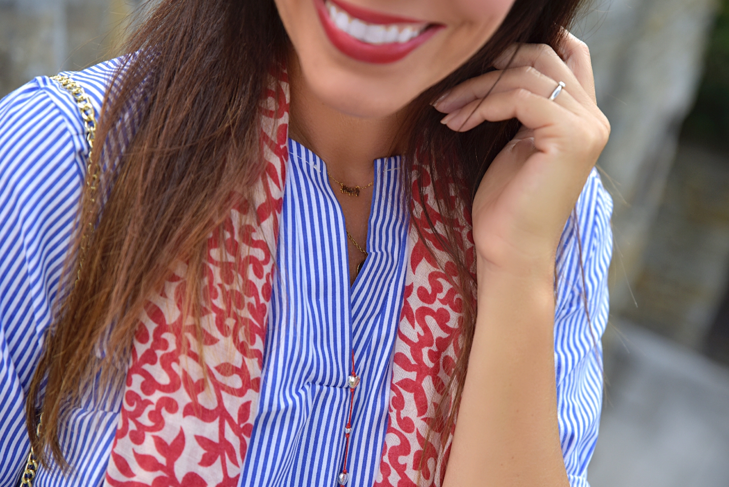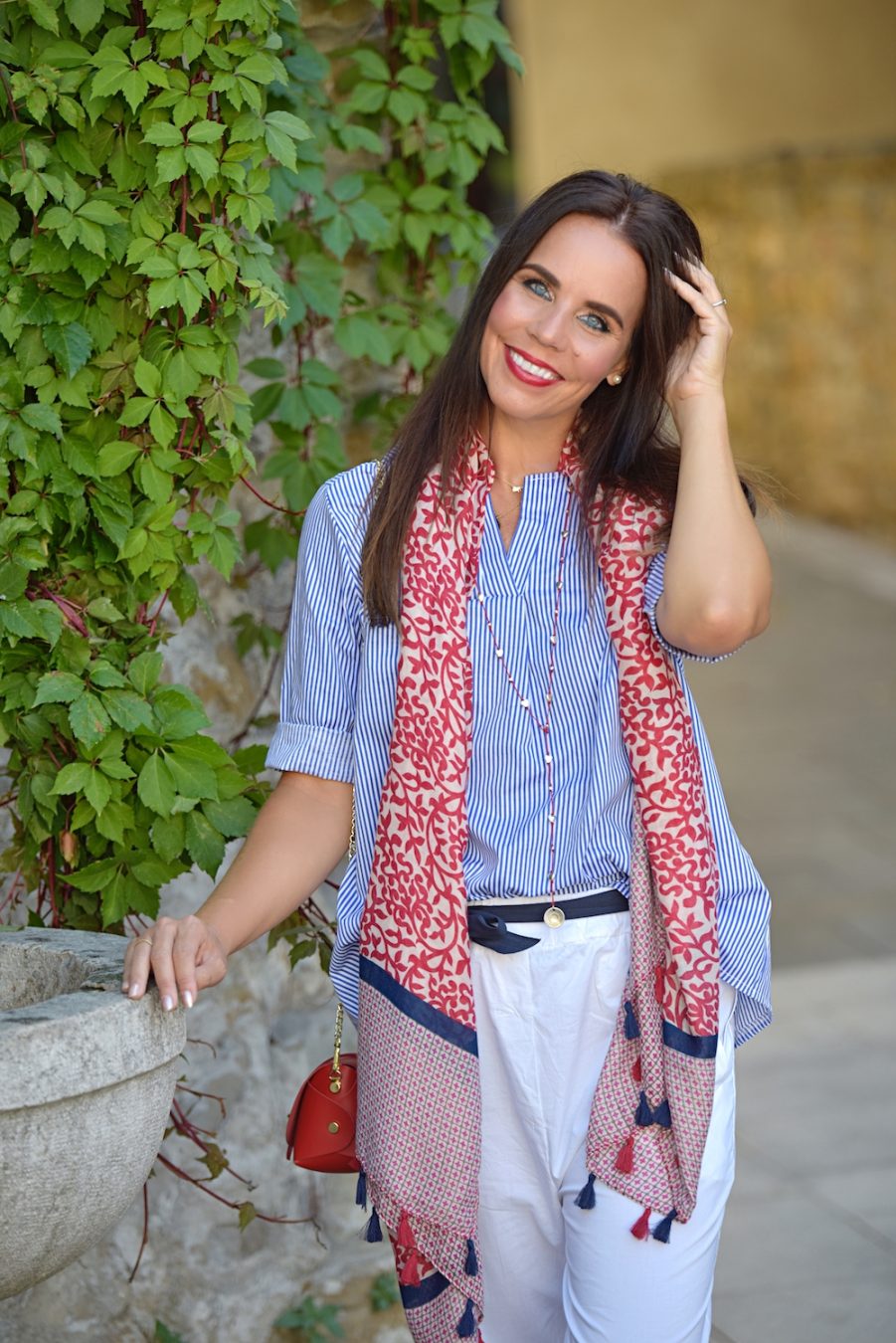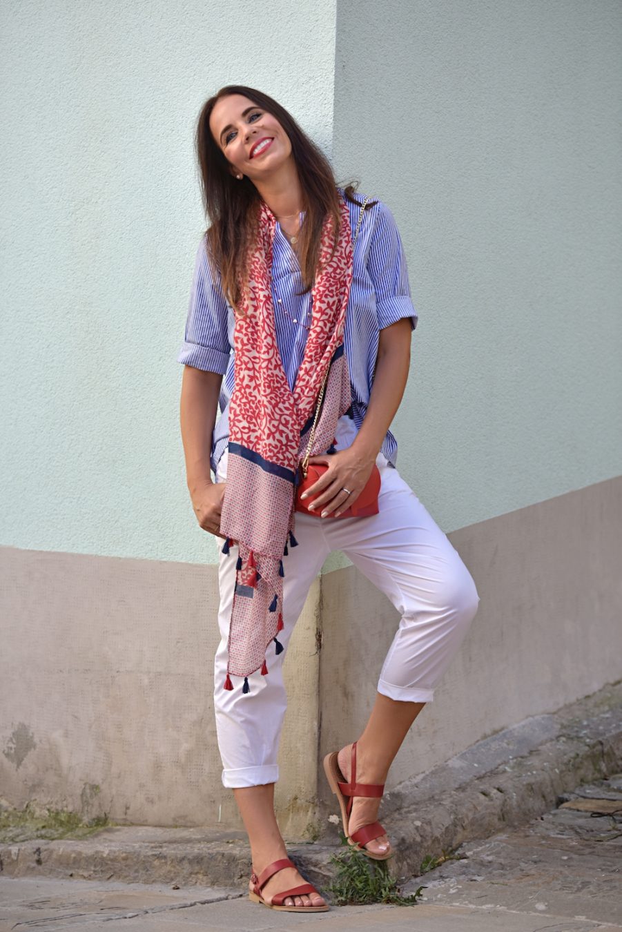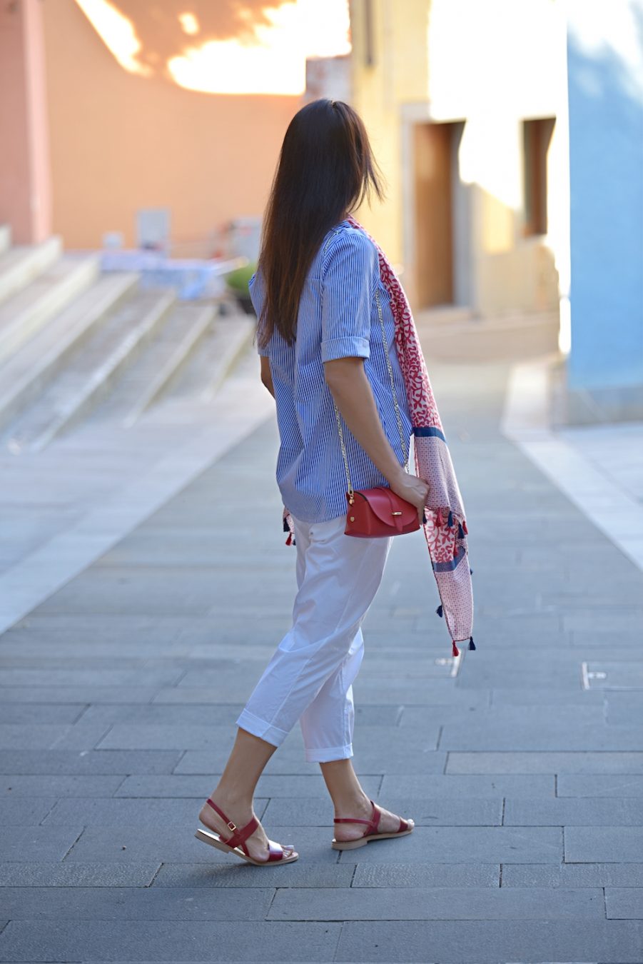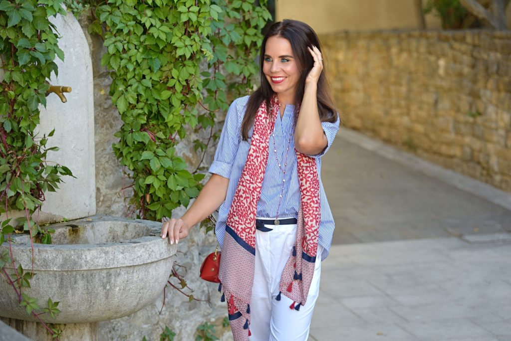 Three colours that always work. The combination between white and blue is something really classic and elegant, if you add a touch of red, then it’s perfect. Even if October is here, the temperatures are still high and I love the chance to walk around wearing flat sandals and no socks at all! Cotton and leather are a must have, I love the super small bag (I know, cute but not so practice) and the baggy pants, but what is even more lovable is the long and soft scarf. This element immediately adds chicness and has the ability to transform you into a woman of style and grace. Many times a scarf is about attitude. It’s a particular mentality and I love it a lot.