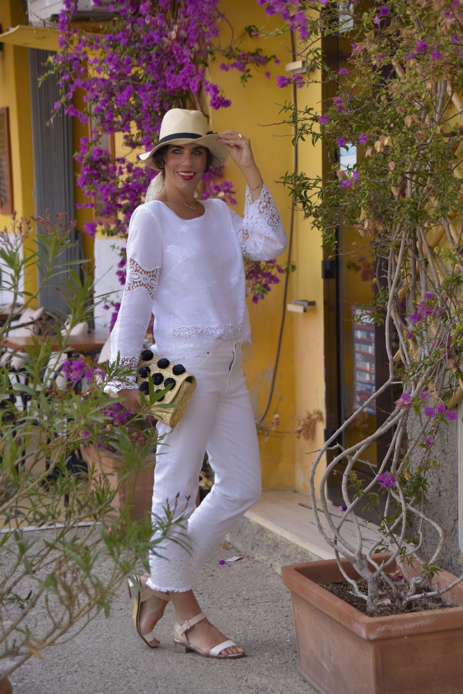 I am a big white colour fan, I can wear this shade all day long and never get bored. I wear it even during winter, because I think it’s fresh, simple, young and very romantic. The color white can represent a successful beginning; I was told that it affects the mind and body by aiding in mental clarity, promoting feelings of fresh beginnings and renewal, assisting in cleansing, clearing obstacles and clutter, and encouraging the purification of thoughts and actions. So, here I am with my brand new Ann Taylor outfit, all in white and lace, cotton and a very strong vacation attitude. I paired it with quite flat sandals and some raffia details, that I simply love: a very nice hat and a clutch bag. I think this is the great outfit to wear on a vacation by the sea, just to walk around and discover new corners, to have a good coffee and talk with friends or kiss an amazing man.
