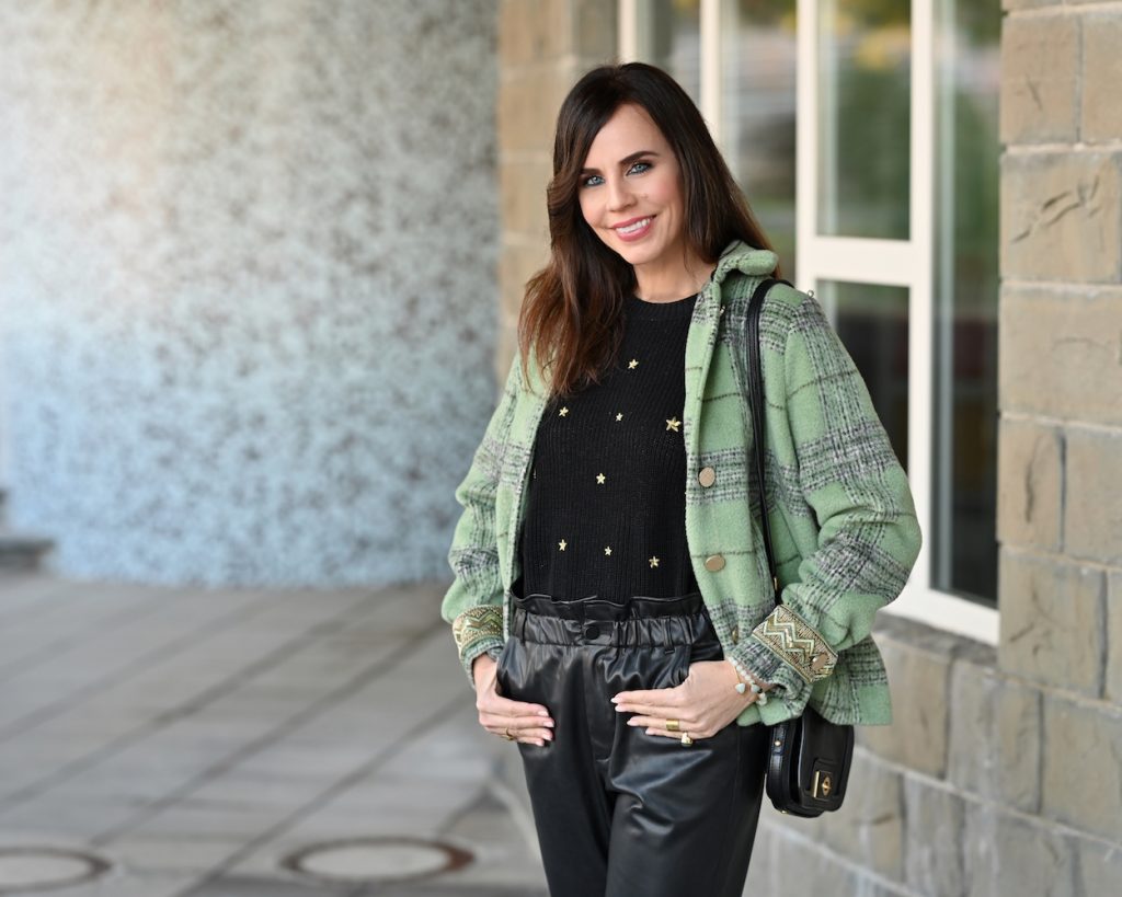 Green represents growth, freshness, luck, and health! There’s something about a lush and elegant green during the winter time that makes everything pop! It’s a seasonal color with so many brilliant shades that are showing up in all my favorite collections. I love the muted seafoam and pistachio tones, as well as the bright chartreuses and shamrock’s that are giving a whole new vibe to runway and street wear. This jacket was love at first sight, so comfortable and nice to wear, I love also the length, a bit shorter and nice to wear with high waisted pants. I have combined it with black leather pants and high heels and I love the small back, cute enough to wear it all year long.