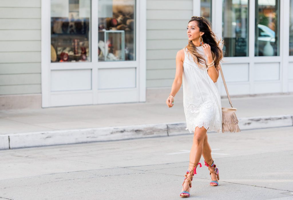 The nature and weight of lace limit the choice of material mostly to cotton, which is perfect for the summer. White is the colour of perfection, the colour of clarity and a wave-length that perfectly balances three natural colours: red, blue and green. Its colour meaning is clarity, purity and completion. It reigns above all other colours in the summer, and it’s the shade that makes us feel fresh and cooler. Lengths of white dresses are quite diverse: midi, mini, or long and peasant style. There are A-line pleated models with frills or ruffles, smooth ones, or comfortably wide styles to choose from. The most desired dresses show off your bare shoulders ‒ styled with flat slip-ons they’re the perfect daytime style.