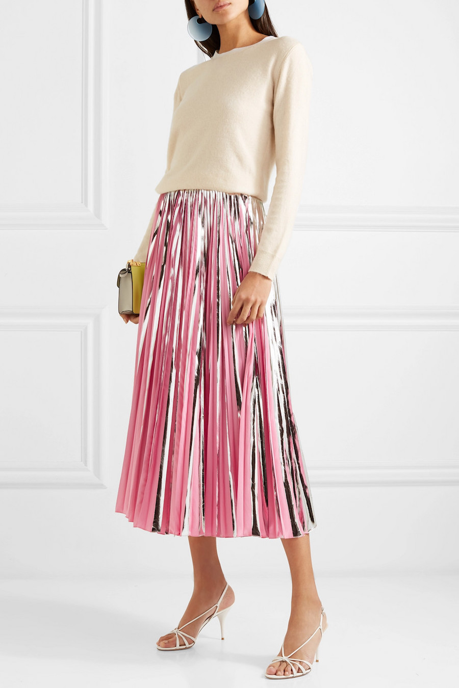 It has to be midi, because it’s the best length to wear and feel really feminine. I love it with a high neck pullover, with a loose top, or an elegant blouse. You have to wear heels, otherwise your legs will look shorter, which is never good. Play with the colours: you can try pink, baby blue, gold, silver, bronze.